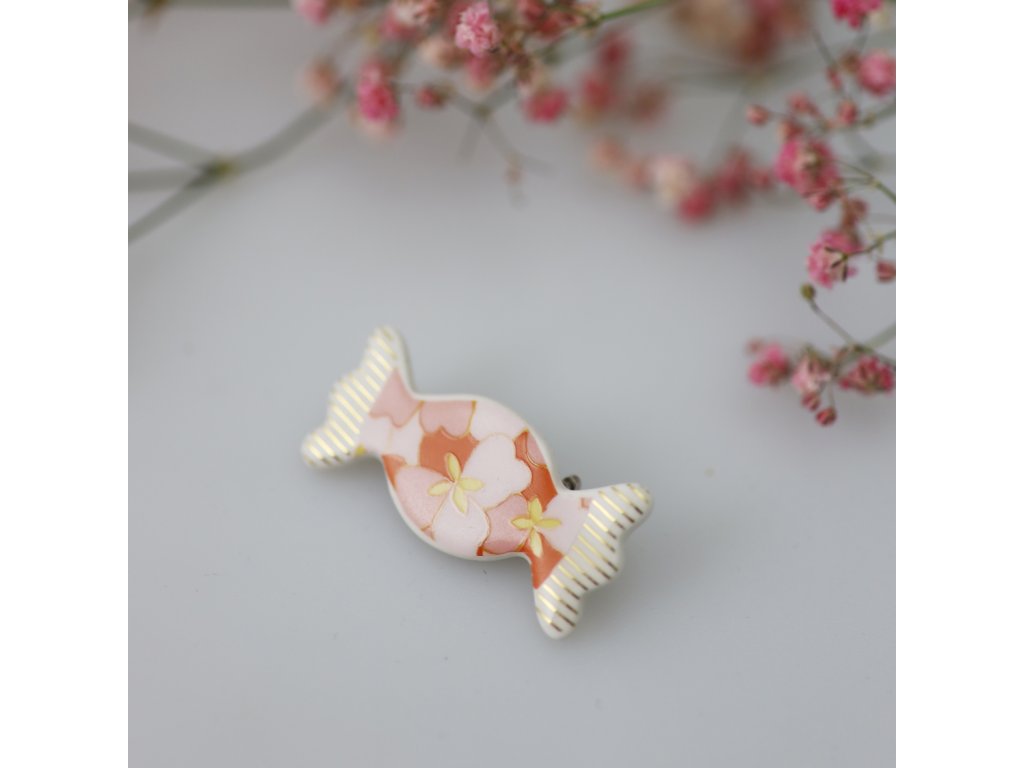 Krásná a originální porcelánová brož ve tvaru bonbonu Váš outfit jako mávnutím kouzelného proutku promění z nudného na zábavný. Tento efektní kousek neujde pozornosti a potěší i zraky okolí.