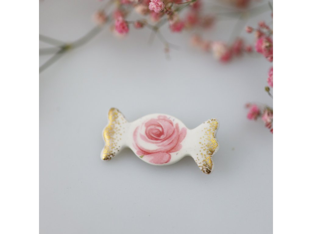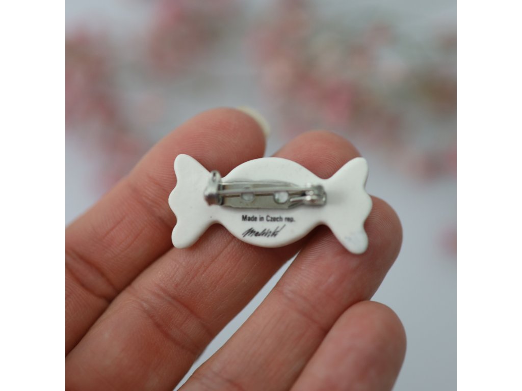 Krásná a originální porcelánová brož ve tvaru bonbonu Váš outfit jako mávnutím kouzelného proutku promění z nudného na zábavný. Tento efektní kousek neujde pozornosti a potěší i zraky okolí.