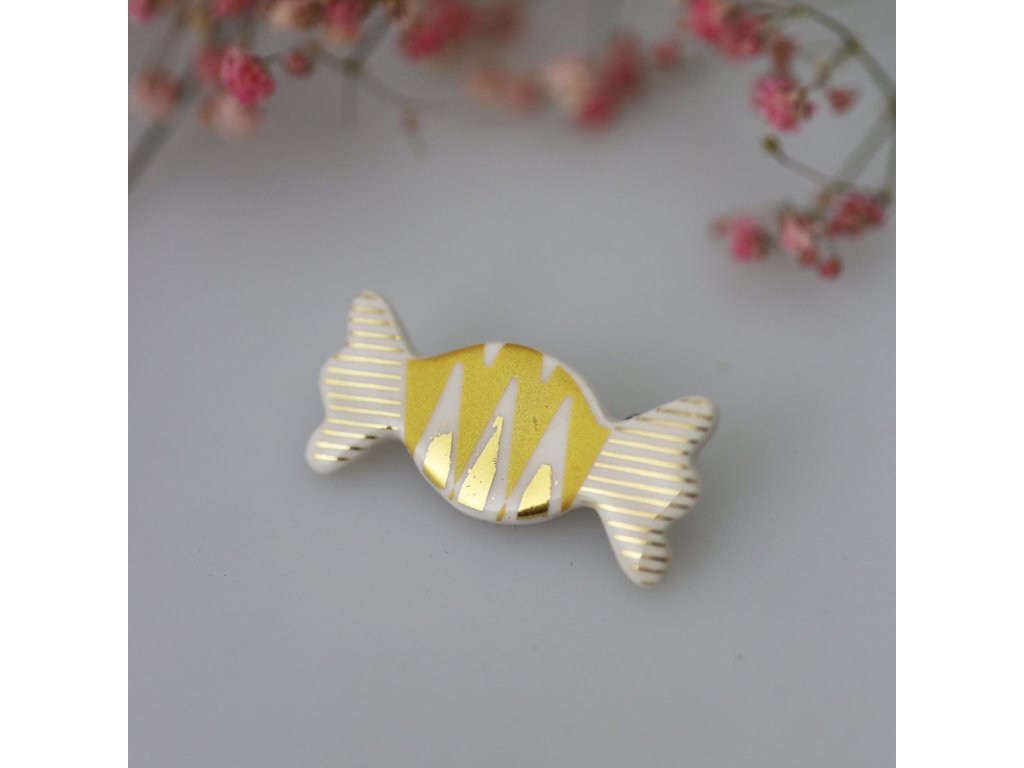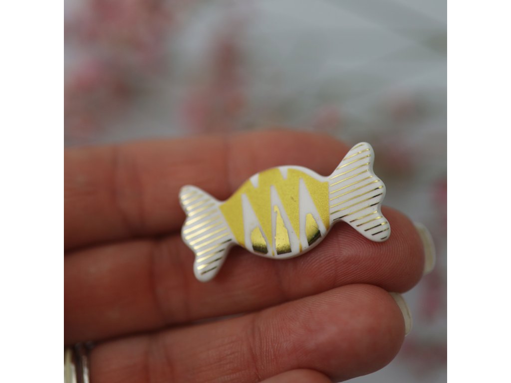 Krásná a originální porcelánová brož ve tvaru bonbonu Váš outfit jako mávnutím kouzelného proutku promění z nudného na zábavný. Tento efektní kousek neujde pozornosti a potěší i zraky okolí.