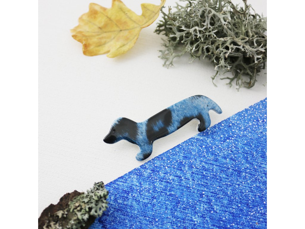 7 cm dlouhá brož Jezevčík s gepardem z karlovarského porcelánu - fantazie plná citu a vtipu, do které se člověk zamiluje takřka hned.