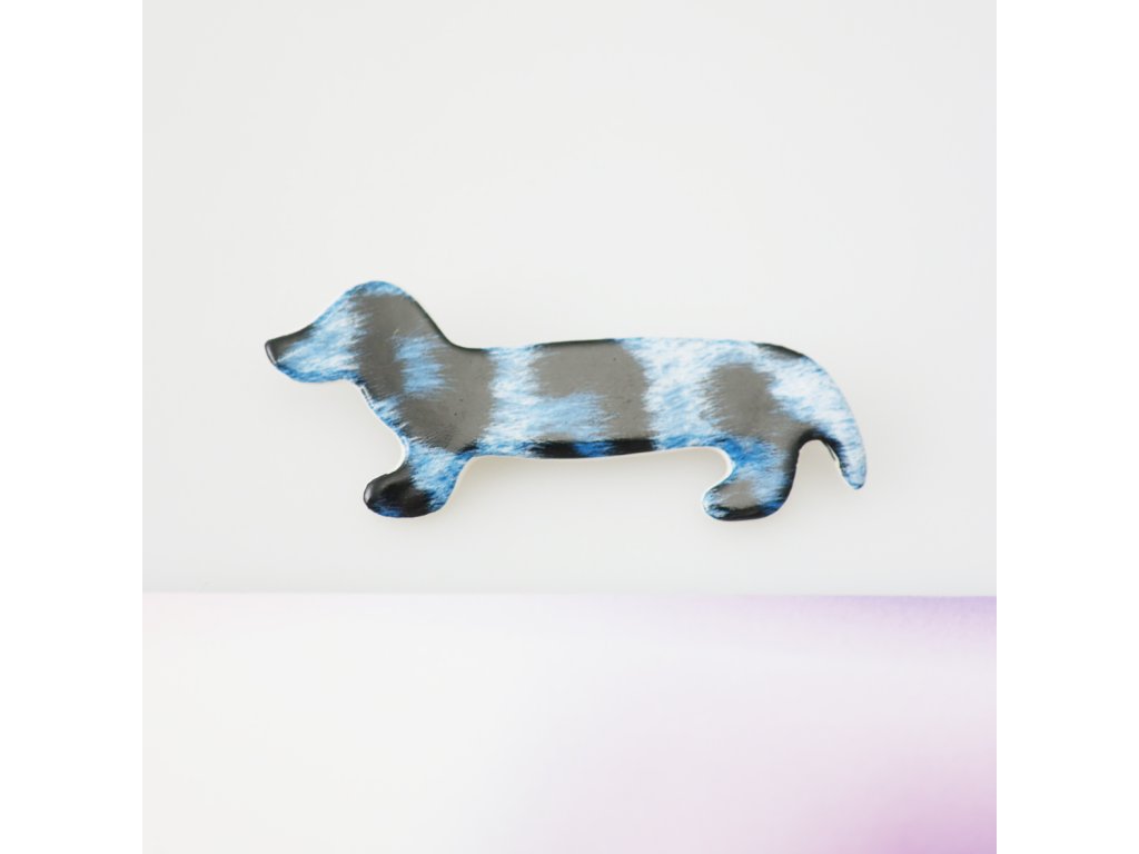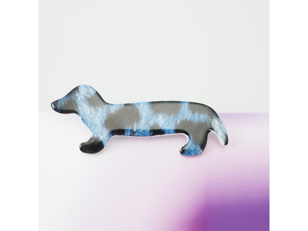 7 cm dlouhá brož Jezevčík s gepardem z karlovarského porcelánu - fantazie plná citu a vtipu, do které se člověk zamiluje takřka hned.