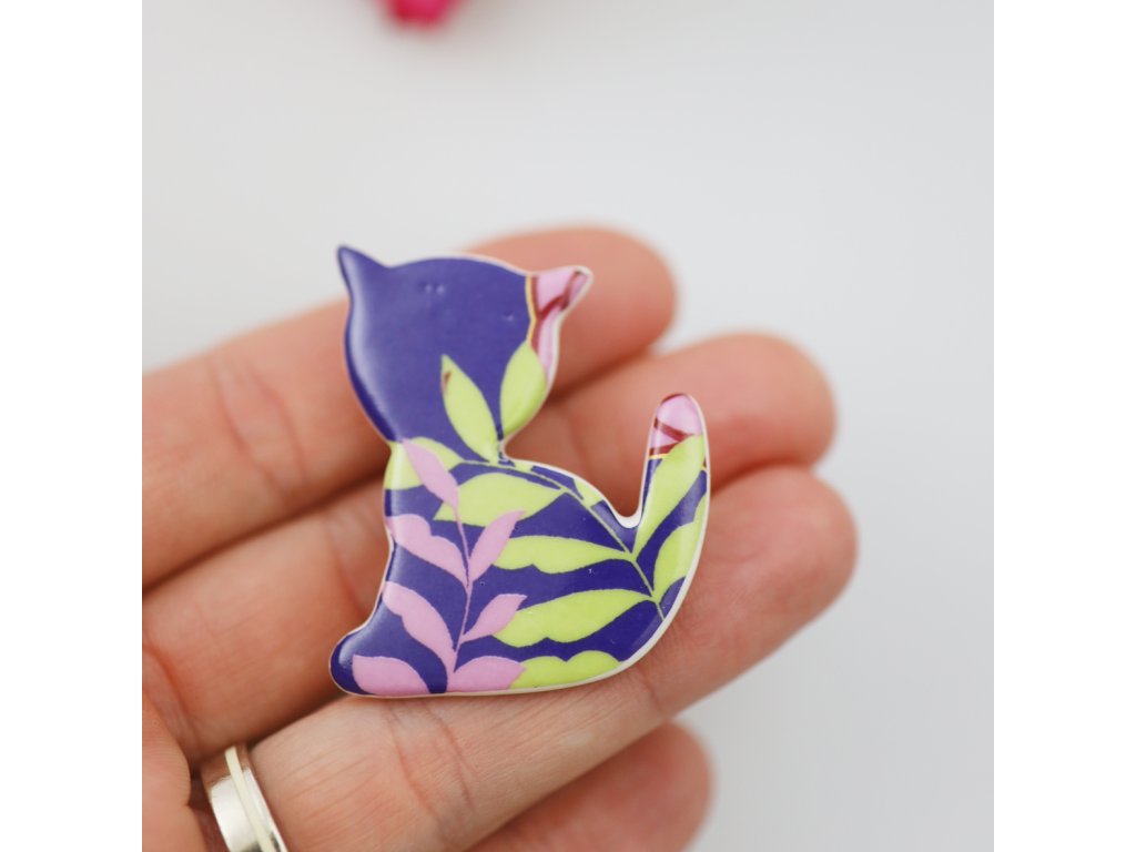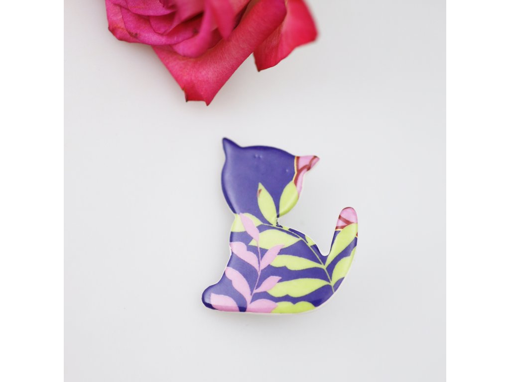 Chcete osvěžit svůj outfit něčím krásným a jedinečným? Skvělou možností je tato originální porcelánová brož plná kočičí roztomilosti a vtipu. Její dekor stylizovaných květů byl vyveden v barvách, které mají šťávu. Dozajista bude ladit s řadou vašich svršků, a to i s těmi, na které jste již možná pozapomněla, ale zasloužily by si vdechnout nový život třeba právě touto krásnou broží pro každodenní nošení.