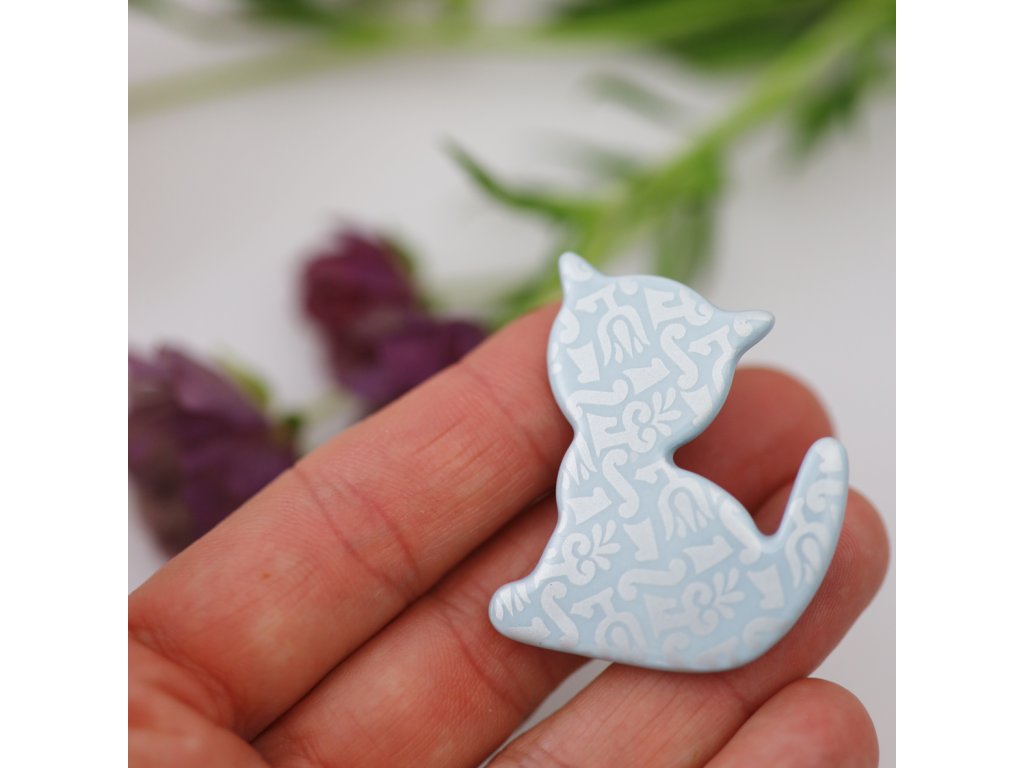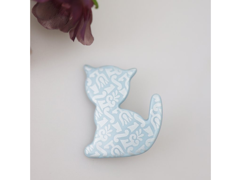 Krásná a originální porcelánová brož Kočka ze světle modrého porcelánu s perleťovým dekorem bude Vaší věrnou a milou družkou, která "rozsvítí" Váš vzhled. Připněte tento kousek na svůj kabátek, sako, šaty nebo halenku a uvidíte rozdíl. Kouzelná brož vhodná (nejen) pro milovníky koček se může stát i krásným dárkem.