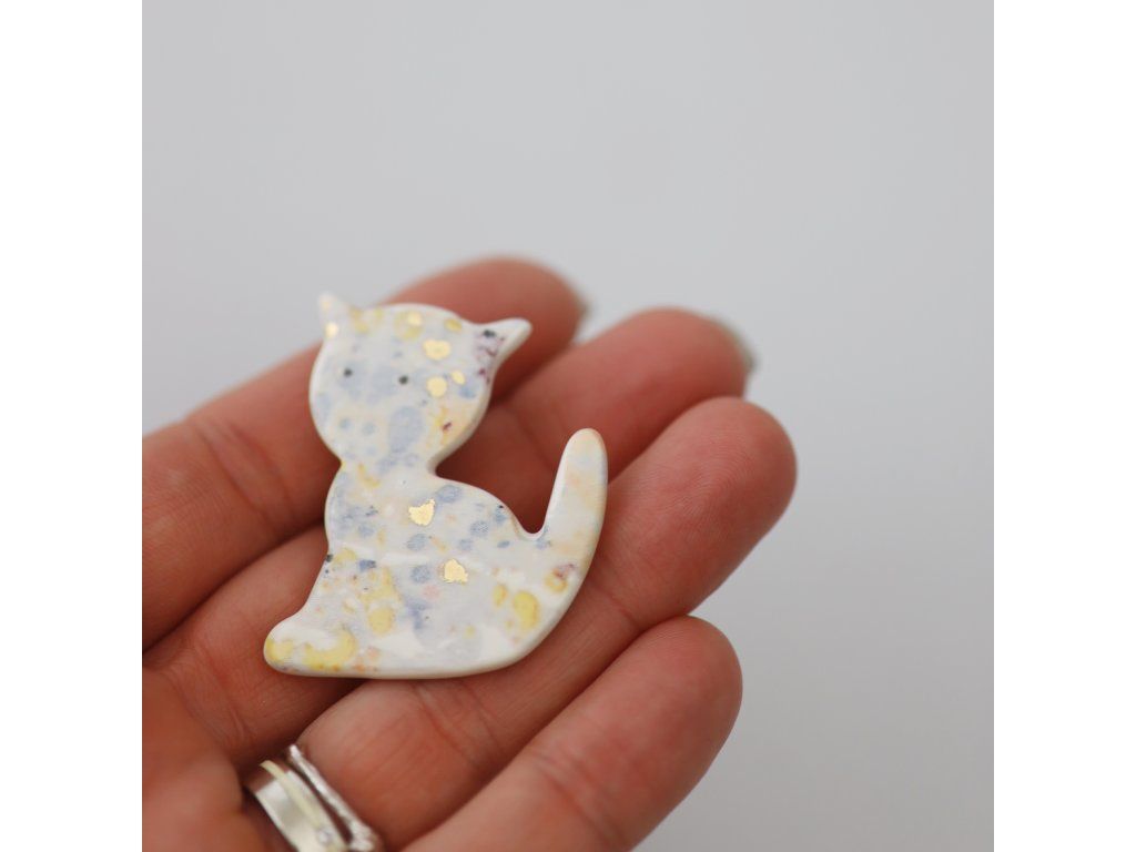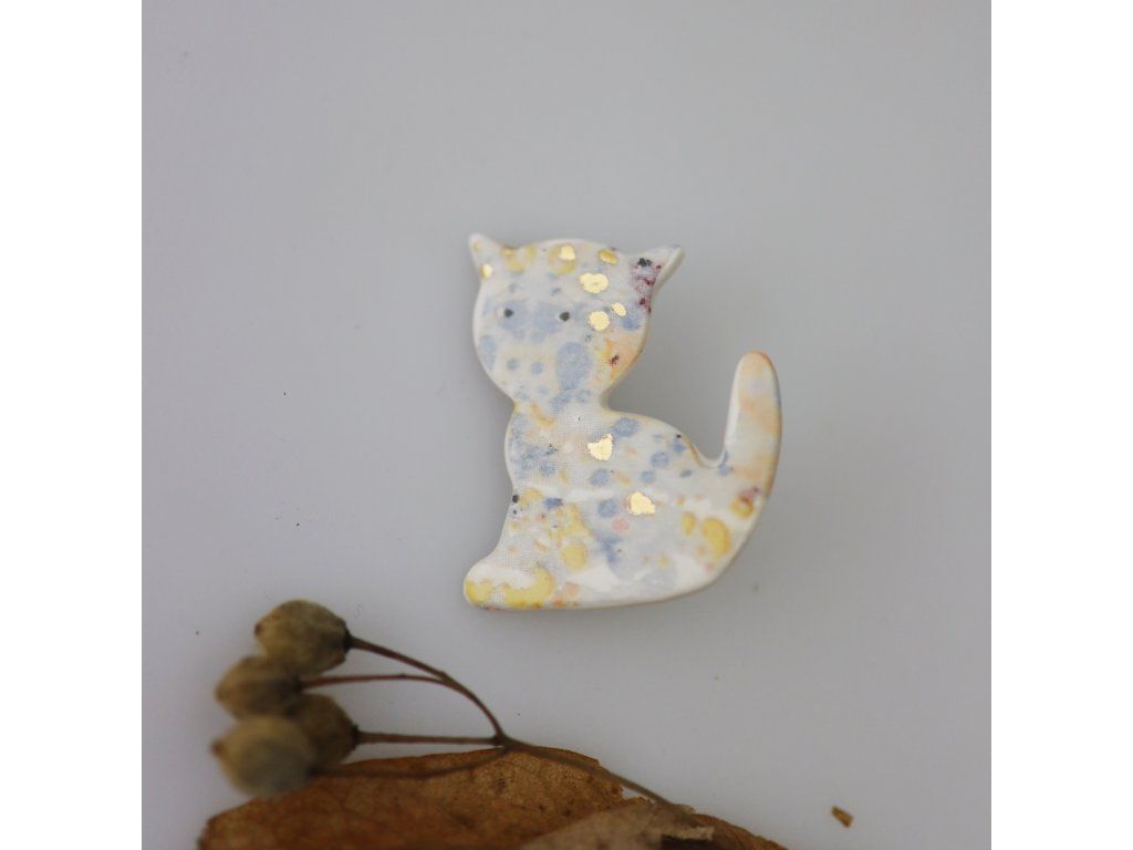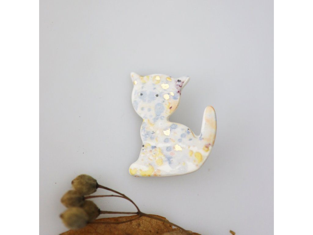 Elegantní brož ve tvaru kočky je lyrická, umí vyprávět jemnými tóny pohádku o království z porcelánu, odkud přichází. Je posetá doteky zlata, tedy života a štěstí, sluneční záře... Má samé krásné zážitky a ty přinese i Vám.