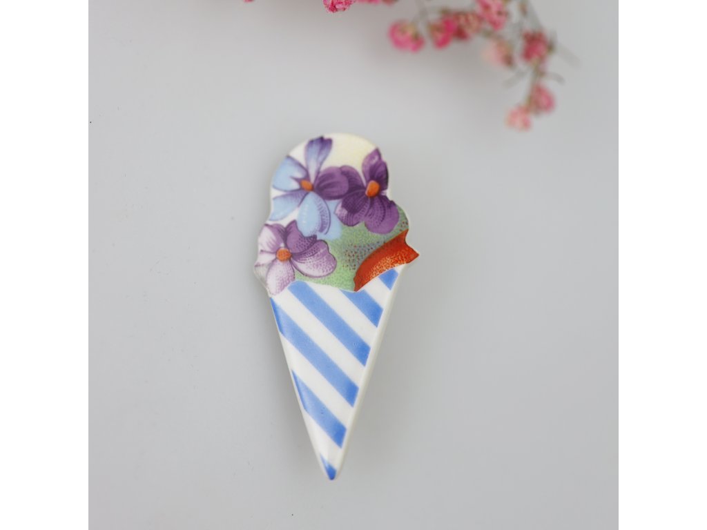 Jemná kolekce porcelánových broží, která spojuje hravé modrobílé proužky s romantickými květinovými motivy. Každý kousek je originál, který oživí váš outfit a dodá mu něžný, svěží nádech. Kornout plný výtečné zmrzliny namíchané z pořádné dávky fantazie! Tato porcelánová brož čeká, aby ozvláštnila právě Vaši halenku!