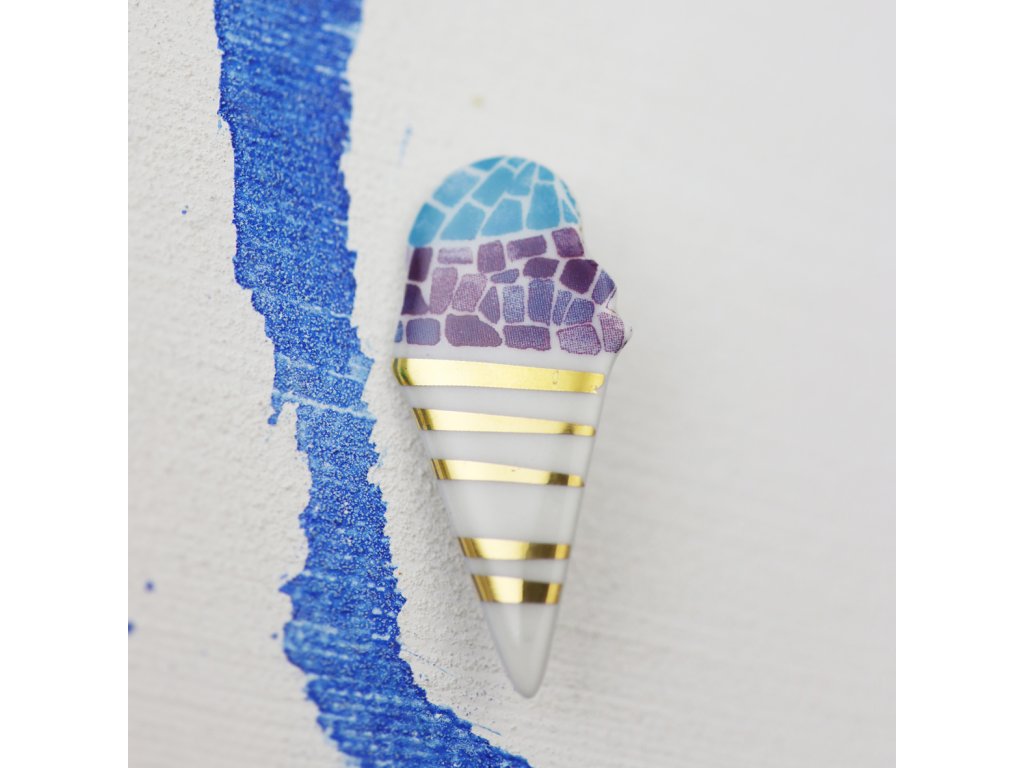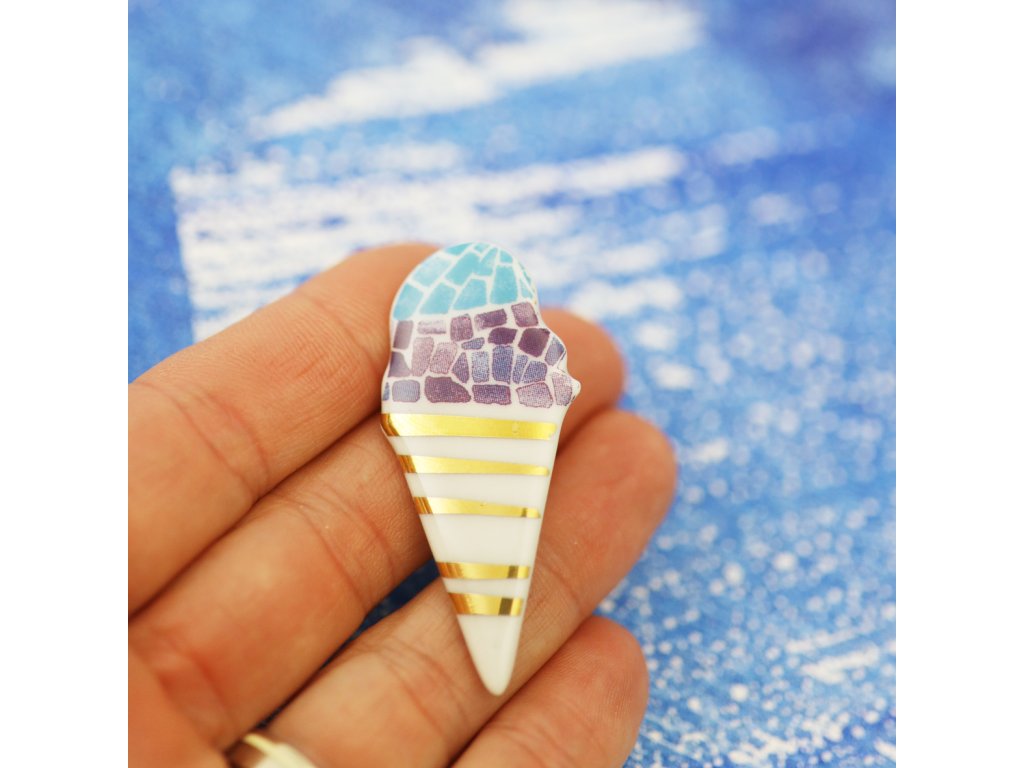 Kornout plný krásy - dokonalé osvěžení vašeho outfitu! Originální porcelánová brož ve tvaru kornoutu se bude báječně vyjímat na klopě kabátku, na svetru i na halence. Zlatými linkami a nádherně barevnou mozaikou zdobená brož zapůsobí jako elixír života pro vaše třeba i pozapomenuté svršky, které by zasloužily znovu najít místo na slunci.