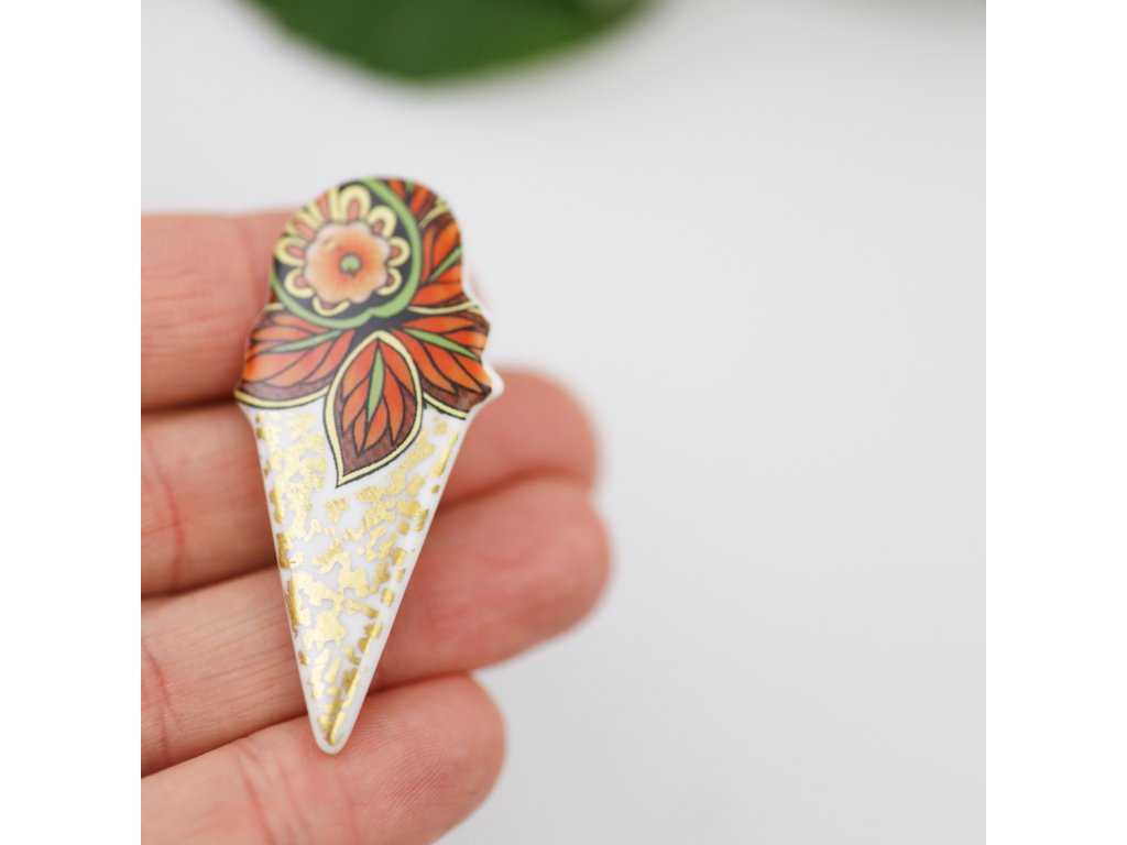 Stylovým doplňkem vašeho kabátku nebo svetříku se může stát tato originální porcelánová brož Kornout. Evokuje hojnost, je krásná a nápaditá. Zlaté doteky ve spojení s lehce retro dekorem stylizovaných květů vypadají skvěle a vy je můžete báječně sladit s různými kousky ve vašem šatníku.