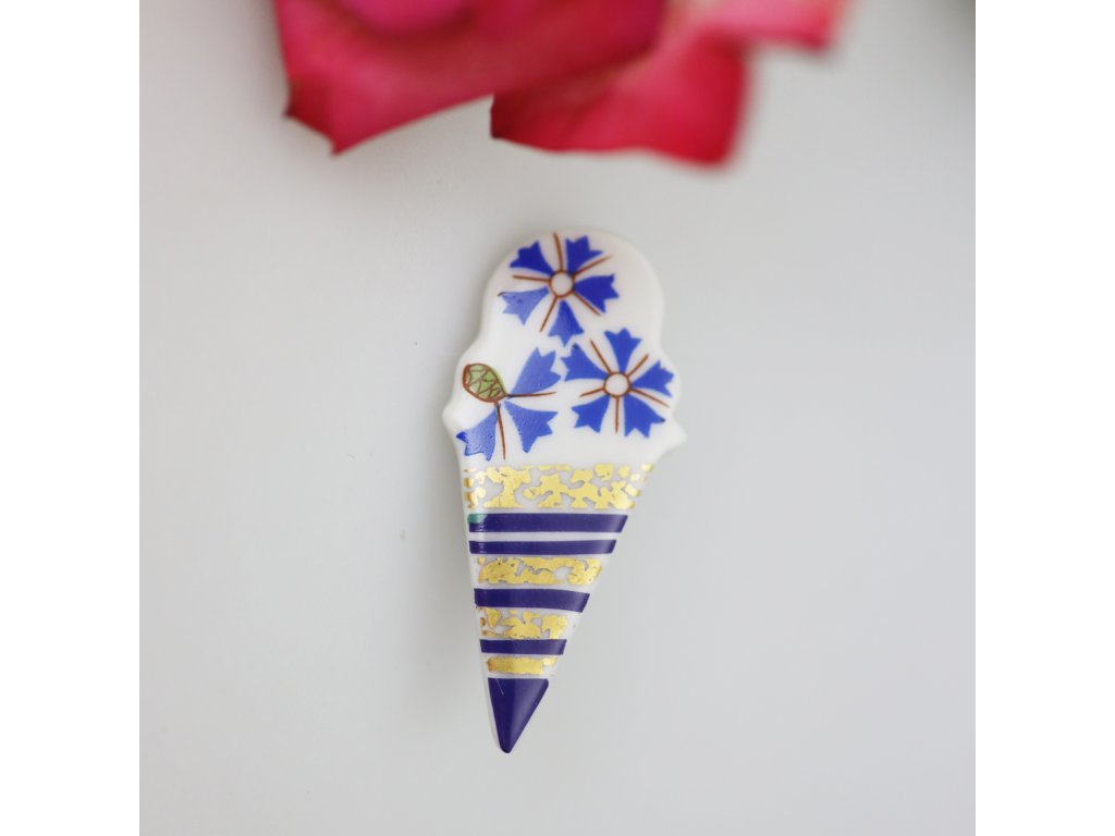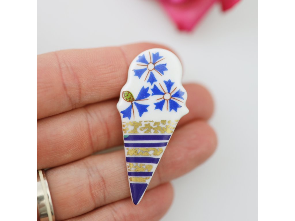 Kornout plný radosti a krásy! Originální porcelánová brož kornout se zlatem a dekorem stylizovaných kvítečků je velmi nápaditá. Fantazie v ní projevená dává inspiraci, jak ozvláštnit či zkrášlit svůj outfit. Tato brož pro každodenní nošení zapůsobí jako živá voda pro vaše jednoduché, možná nudné či pozapomenuté svršky. Buďte kreativní a svá.