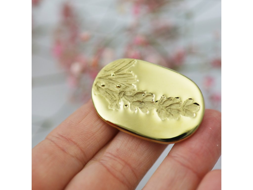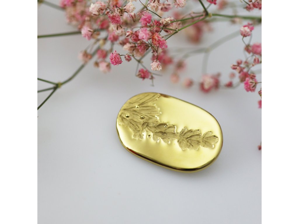 Originální ovál se zlatým otiskem přírody Vám dodá styl. Zazářit s ním je rázem snadné. Skvěle vynikne na klopě saka, na halence pozvedne outfit formálnějšího tónu ale i romantické rozevláté šaty...