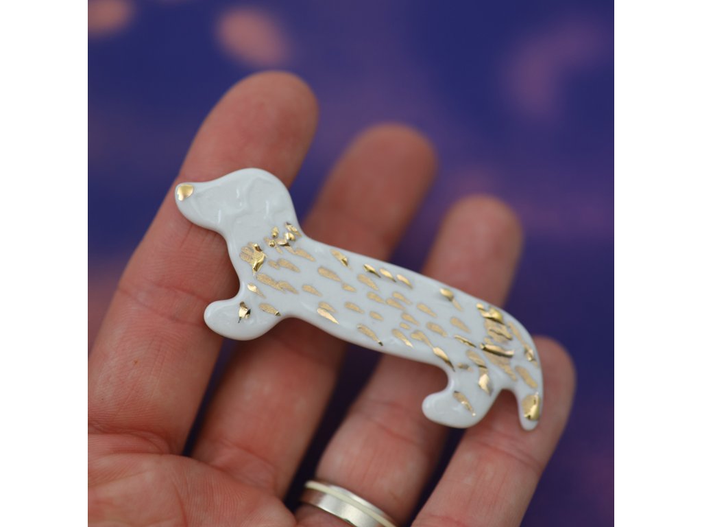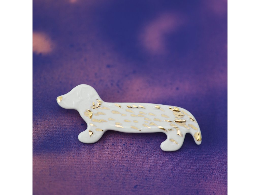 Stylová, netradičně umělecky pojatá, originální porcelánová brož Jezevčík působí skoro jako pocta všem jezevčíkům. Elegantní, lehce luxusní brož nepostrádá vtip a nádherně ozdobí Vaši halenku, šaty nebo sáčko. Zlatá kresba v sobě nese sluneční zář a životadárnou energii. Neváhejte a vneste do svého šatníku exkluzivní a přitom hravý doplněk, který nezklame.
