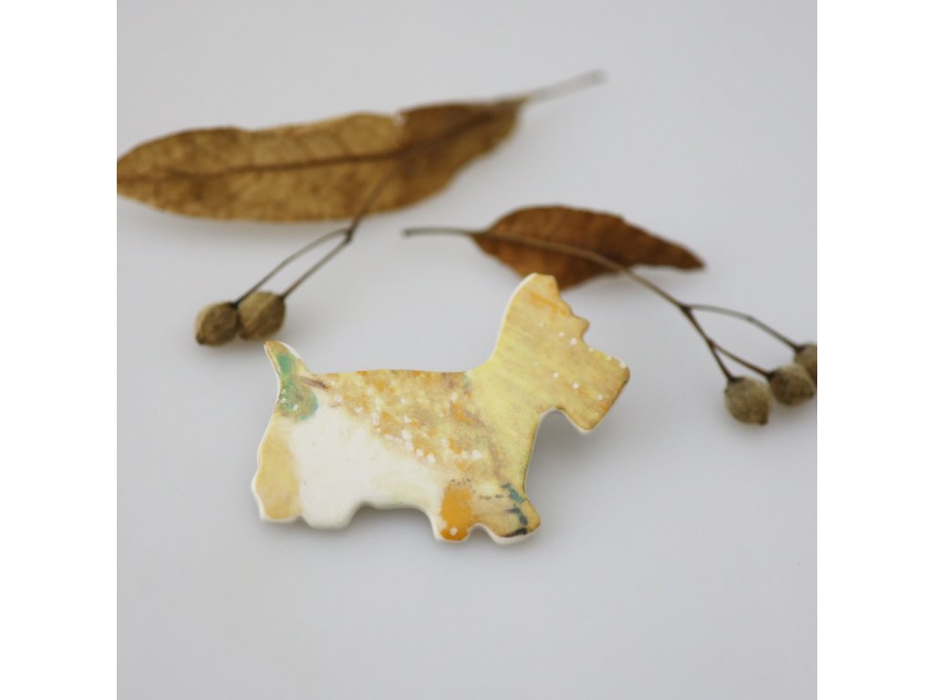 Originální brož pejsek Westík (délka 6 cm, výška 4,5 cm) z karlovarského porcelánu. Skvěle osvěží Váš šatník. Líbí se Vám? Pak neváhejte.