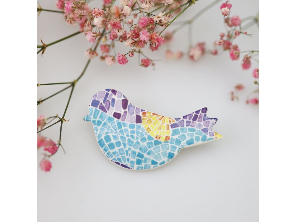 V krásných barvách vyvedená porcelánová brož Ptáček ozvláštní a osvěží Váš šatník, dodá vtip a originalitu kouskům možná už dávno zapomenutým, ke kterým je dobře se vrátit. Podobně jako k mozaice...