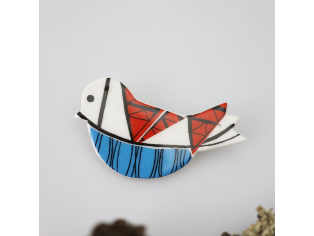 Originální porcelánová brož ve tvaru ptáčka s moderním geometrickým dekorem v červené, černé a modré barvě. Minimalistické linie a výrazné kontrasty dodávají šperku originální a hravý vzhled.