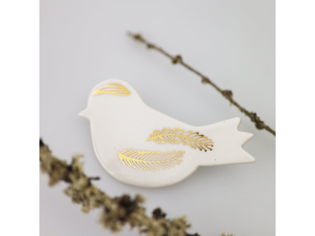 Půvabnou a zcela originální porcelánovou brož zdobí ruční kresba pravým zlatem. Líbezný ptáček se zlatými pírky nepostrádá něhu, ani vtip a lehkou eleganci. Vynikne na řadě vašich outfitů a dodá jim docela nový ráz. Oživte tímto ptáčkem svou halenku, kabát nebo svetr a pocítíte rozdíl.
