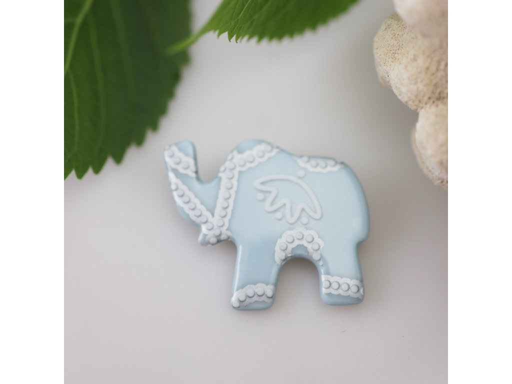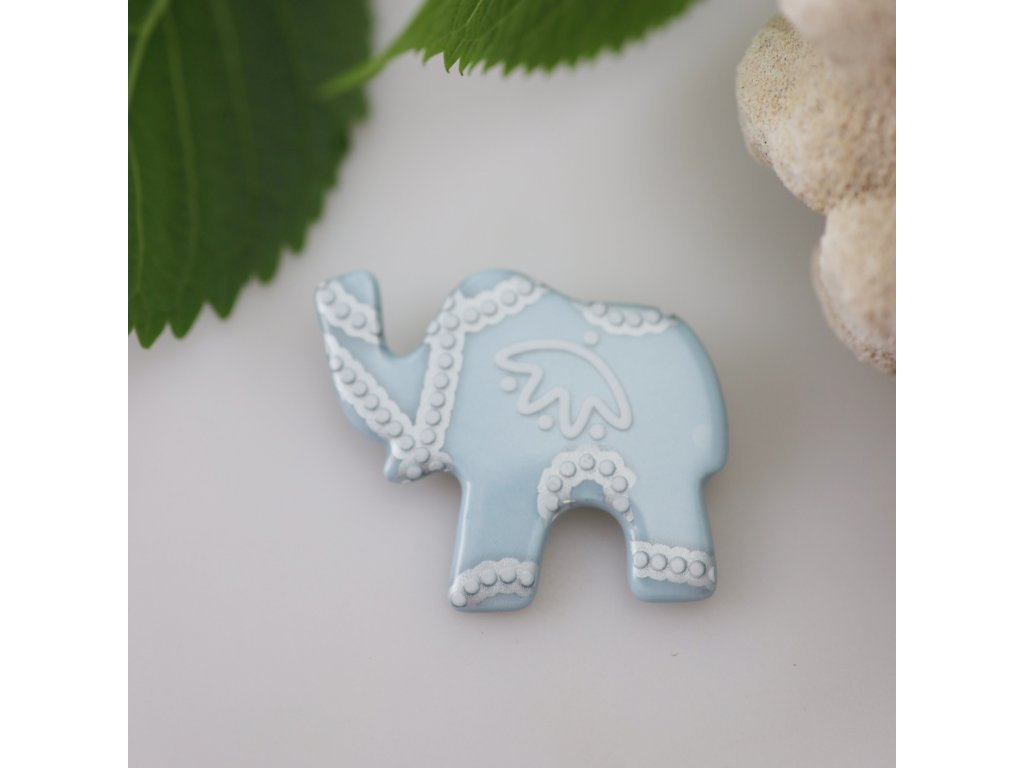 Slon - symbol štěstí, moudrosti, zkušenosti, ale také loajality, společenství a jednoty - může krášlit právě Vás. Jako originální porcelánová brož v něžném, světlounce modrém provedení a bílou ornamentikou ozvláštní každé šaty, halenku, svetřík, kabát i sáčko. Připněte jej třeba k jednobarevnému svršku a poznáte rozdíl. Hodí se i jako krásný dárek.