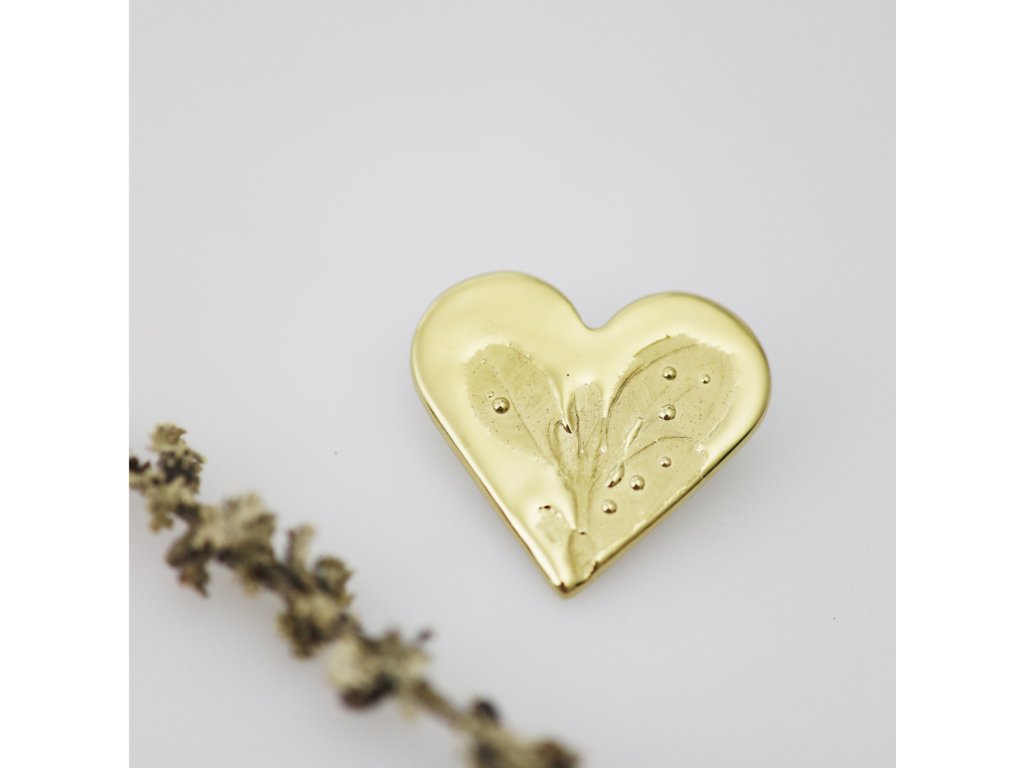 Zlaté srdce z karlovarského porcelánu - originální porcelánová brož z kolekce Paměť krajiny ozvláštní váš outfit, kterému dodá nádech luxusu. Umělecké pojetí činí z brože neopakovatelný kousek, krásný na pohled i na omak. Jedinečný otisk vypráví příběh. Pokaždé ho můžete vnímat jinak. Ozvláštněte své šaty či halenku tímto skvostem...