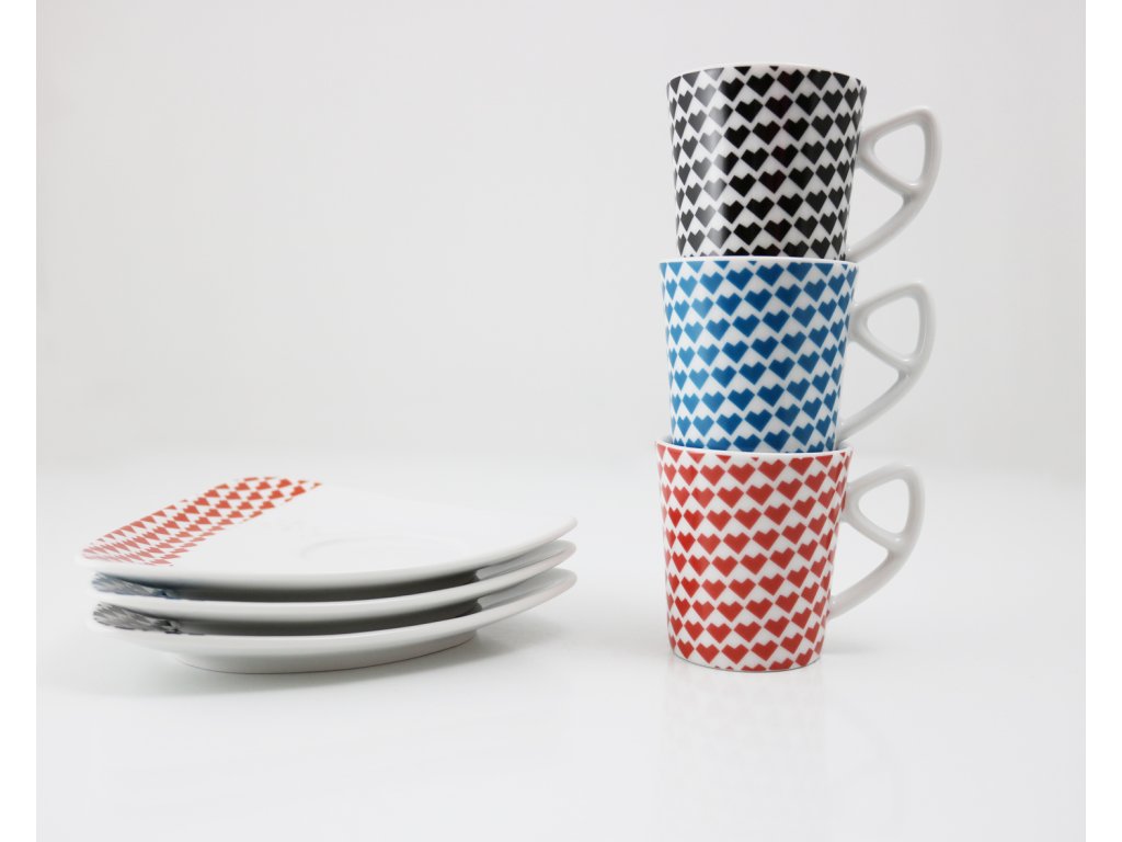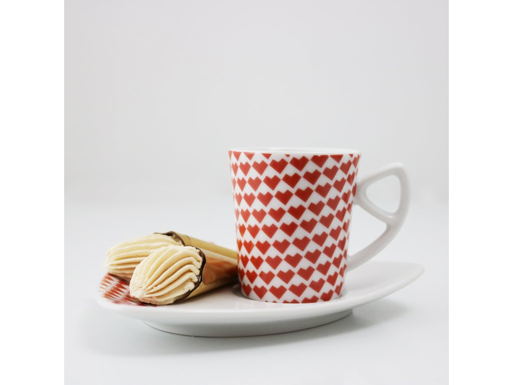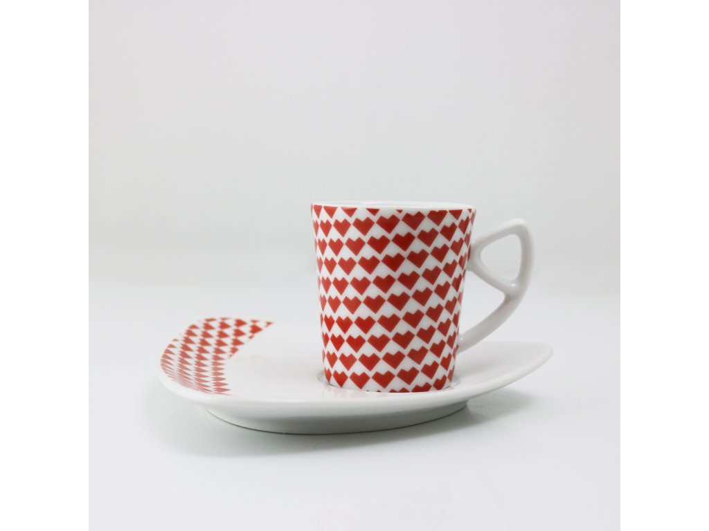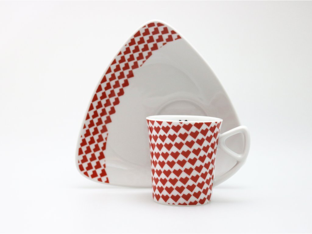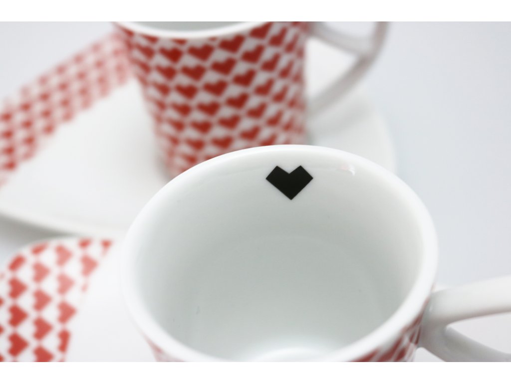 Silnostěnný šálek (75 ml) s podšálkem z tvrdého porcelánu zdobí unikátní dekor srdíček. Podšálek autorka koncipovala tak, aby se na něj vešlo víc než jen lžička, přitom zůstal dobře skladovatelný a praktický. Délka hrany podšálku je 15 cm, průměr 14 cm.