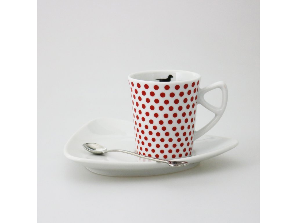 Autorský, silnostěnný šálek na espresso z nejkvalitnějšího porcelánu zdobí sympatické puntíky, uvnitř šálku (i na podšálku) však naleznete milý detail, který šálku dodává zcela originální atmosféru. Vlk, zajíc, kočka, laň a další... Kombinujte s radostí!