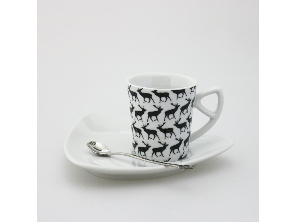 Autorský silnostěnný šálek (75 ml) a podšálek z karlovarského porcelánu s fantastickým dekorem.  Motiv jelena je nejen veselý a zde i velmi esteticky zdařilý. Jelen má bohatou symboliku v mnoha kulturách. Na netu se dočtete třeba toto: "Jelení energie je důstojná a pevná, má v sobě množství nadhledu, klidu i laskavosti. V keltské tradici je jelen svázán také s archetypem duševní i materiální nezávislosti, proto nám může věnovat dostatek síly k tomu, abychom mohli manifestovat své tužby a potřeby také do reality okolo nás."