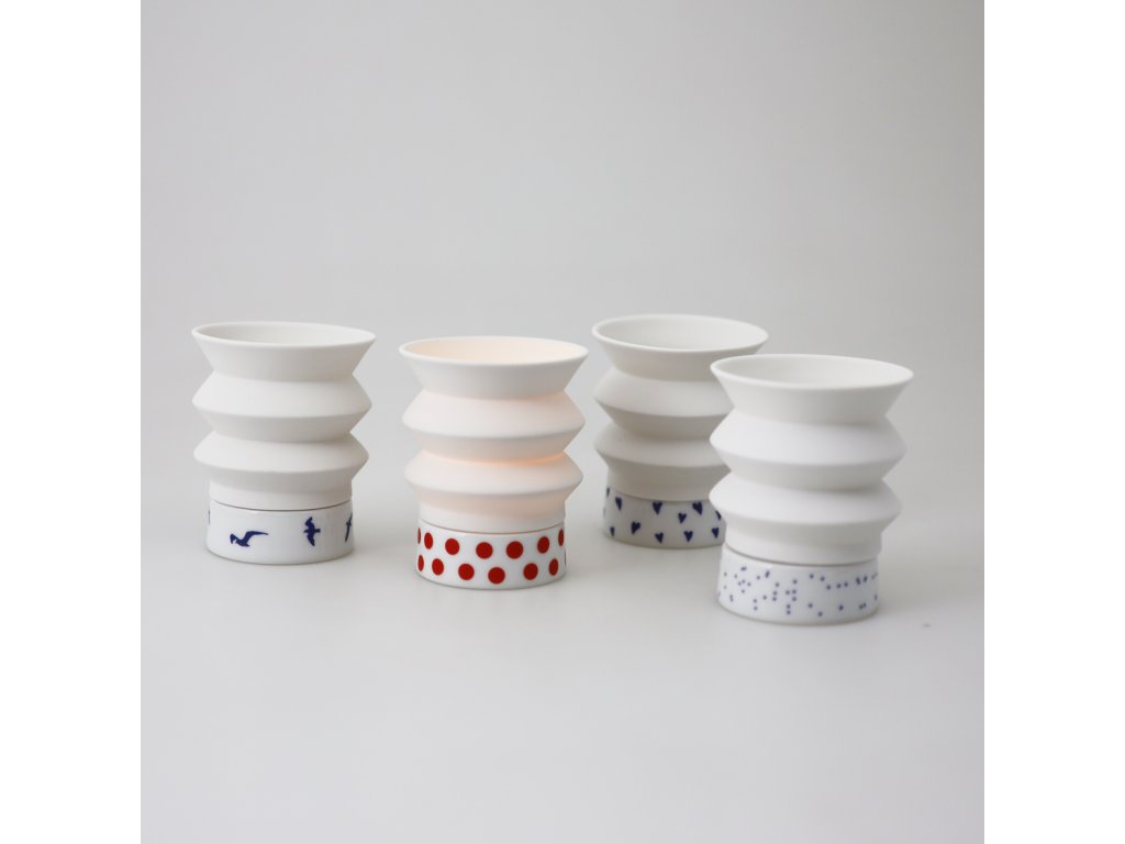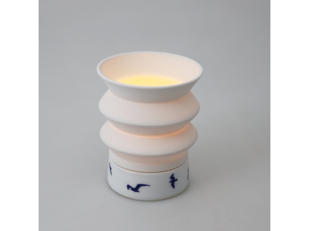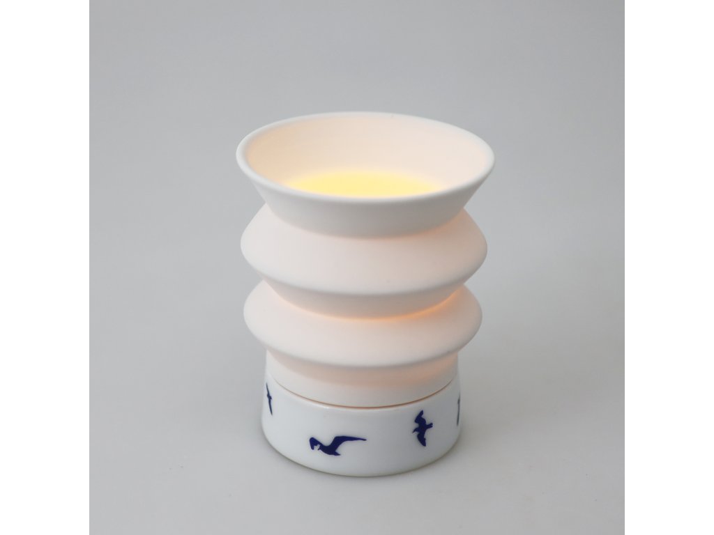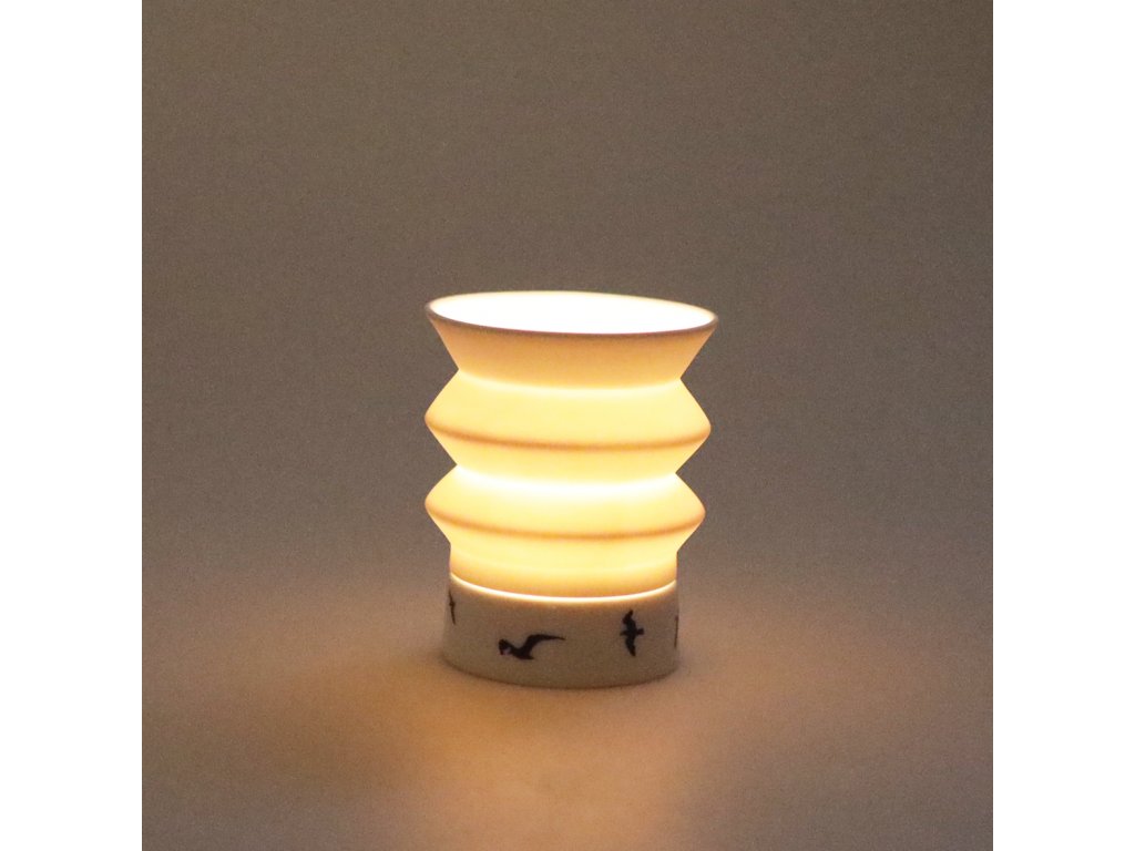 Lampionek má biskvitovou horní část (porcelán bez glazury), která je tenká a krásně propouští světlo. Spodní část s glazurou se velikostně přesně hodí na čajovou svíčku a je dekorovaná motivem racků v letu. Tento lampion můžete kombinovat s celou kolekcí RACEK.