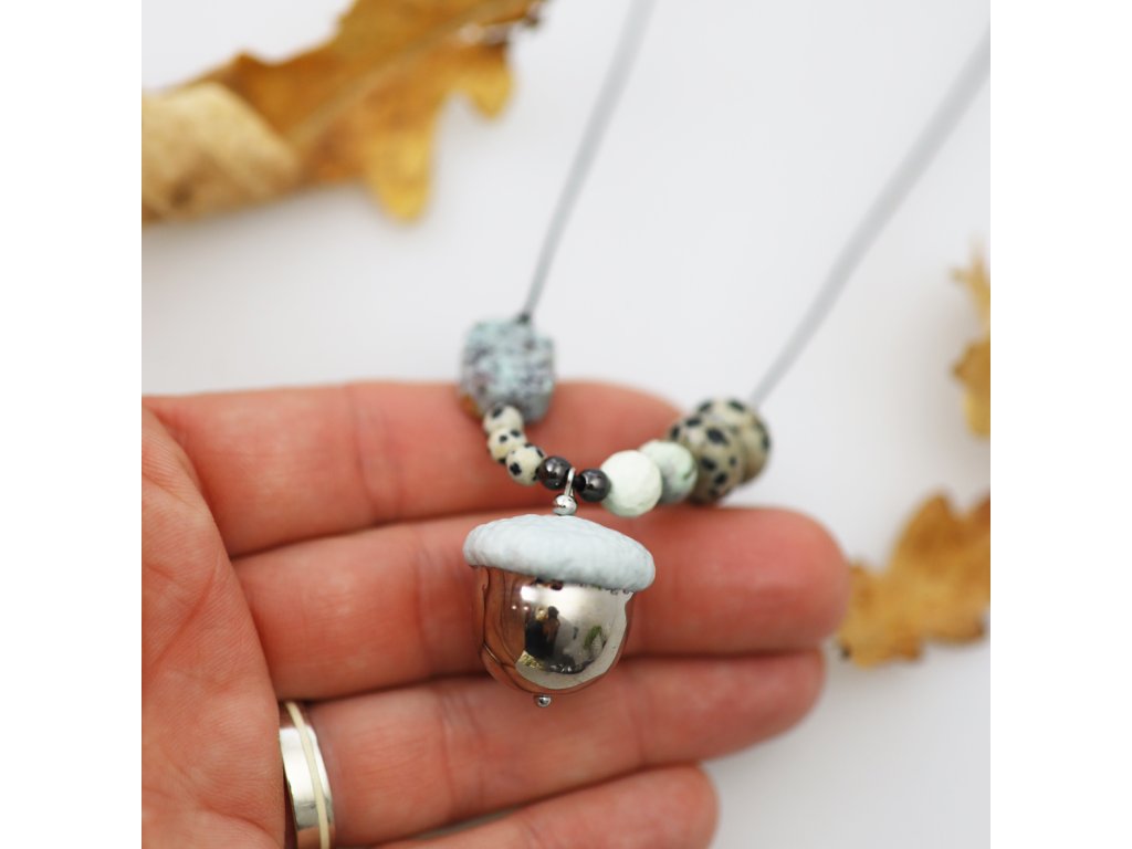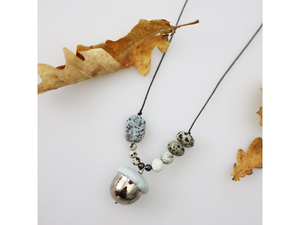 Porcelánový žalud malovaný platinou patří ke kultovním kouskům Studia Malíská. Se září planoucího Měsíce a v překrásném objetí minerálů tak vzniknul magicky krásný náhrdelník, který - ač jemný - vyzařuje sílu. Jedinečné kouzlo tohoto náhrdelníku si zamilujete. Objevte moc originality a buďte svá.