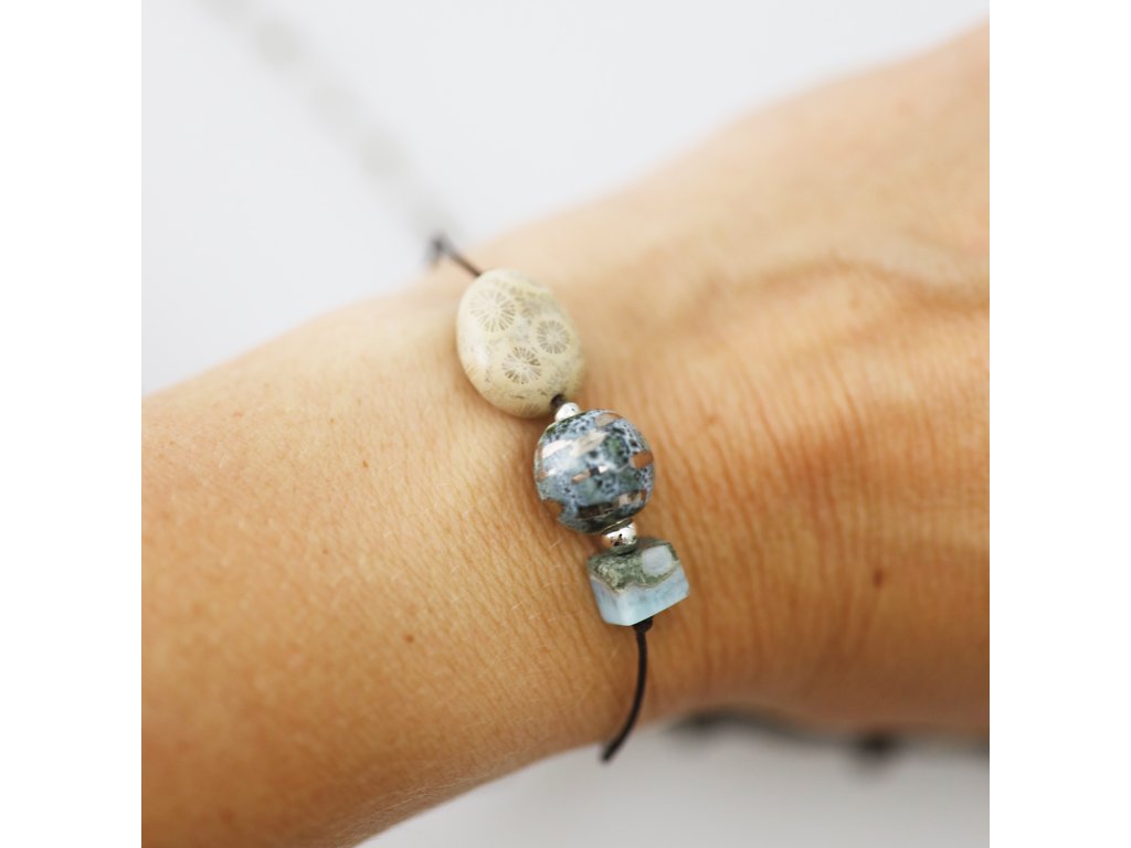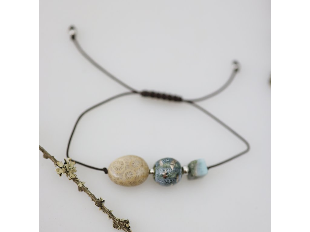 Ležérní, vkusný a přece výjimečný! Unikátní náramek s porcelánovým korálkem malovaným platinou doplňuje chryzantémový kámen a larimar. Neopakovatelná kompozice se zcela originálním porcelánovým středem dokonale ozdobí vaše zápěstí. Dejte přednost jemné, originální kráse!