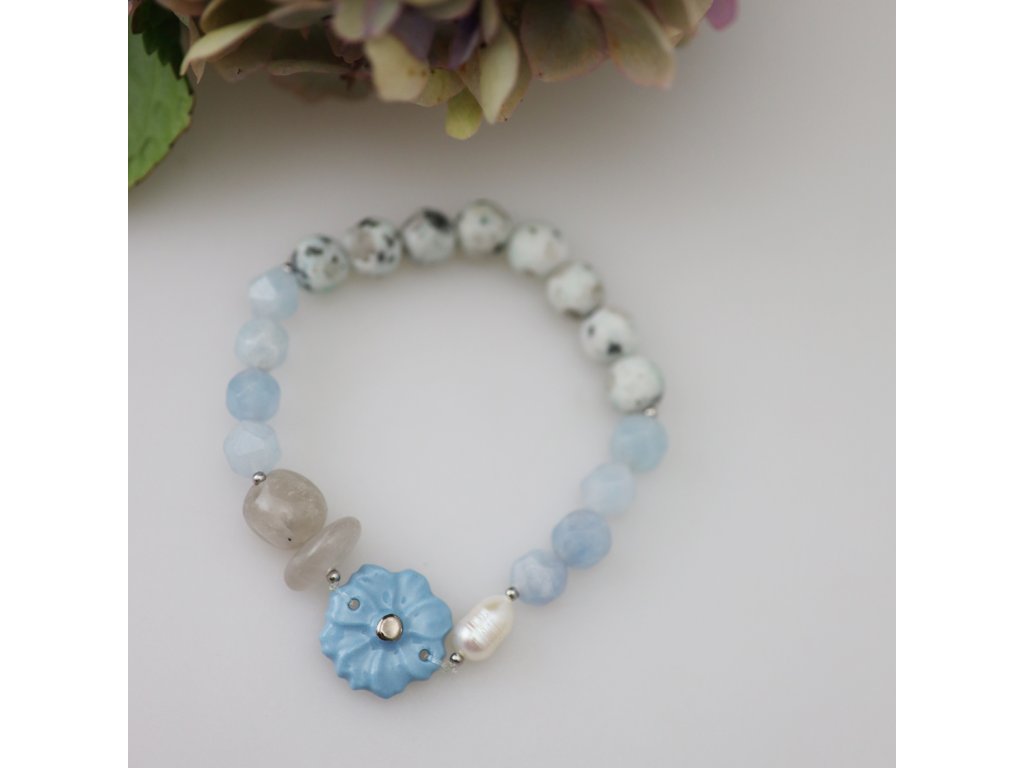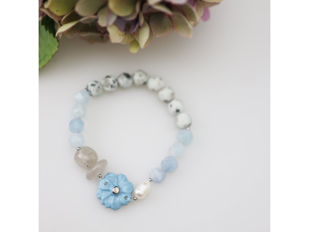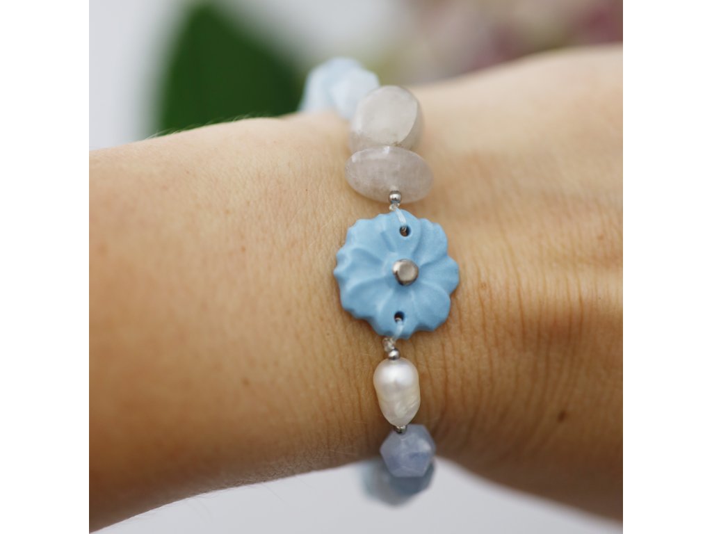 Unikátní náramek s porcelánovým Kvítkem a polodrahokamy jitří emoce i fantazii. Zasněte se. Ponořte se do nejčistší rosy, projděte se bosýma nohama kouzelným potokem, na jehož březích rozkvétají nebesky modré kvítečky se stříbrnými doteky hvězd... Uvolněte svoji mysl a prožívejte krásu tohoto náramku. Zkrášlí vaše zápěstí a stylově doplní Váš outfit. Neváhejte.