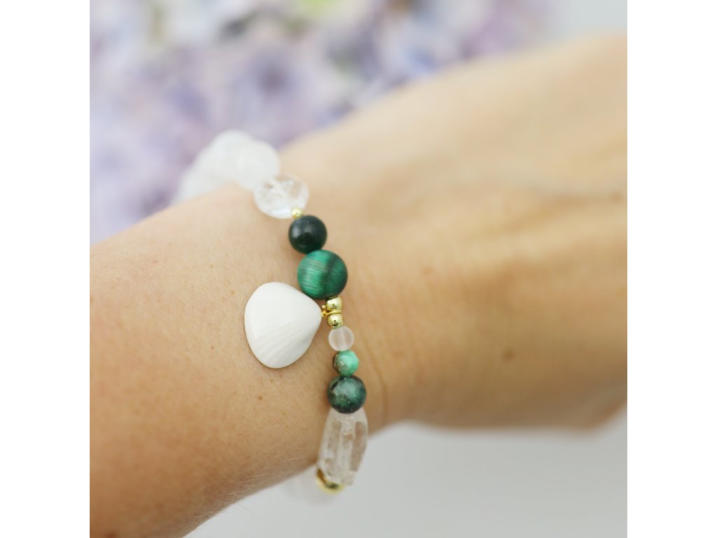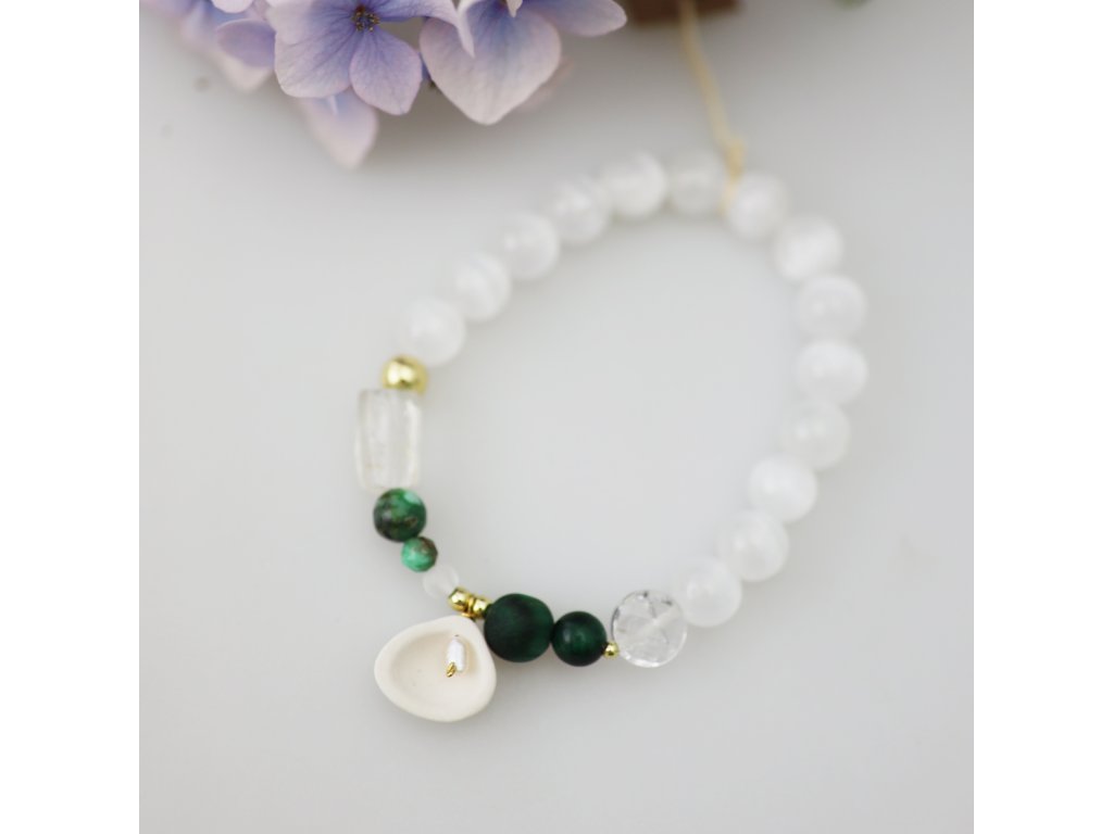 Unikátní náramek s porcelánovou mušlí a minerály zkrášlí Vaše zápěstí osobitým způsobem. V duchu nás svou krásou vede na jemnou písčitou pláž, kde šumí moře... Vrhněte se do víru pozitivní energie a nechte se unést originální, průzračnou krásou tohoto jedinečného šperku. Líbezná porcelánová mušlička rafinovaně skrývá i odkrývá přírodní perlu. Hodí se i jako dárek blízkému člověku.