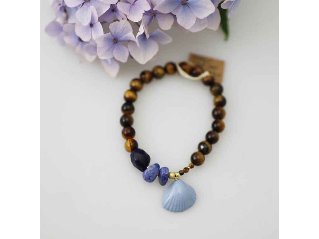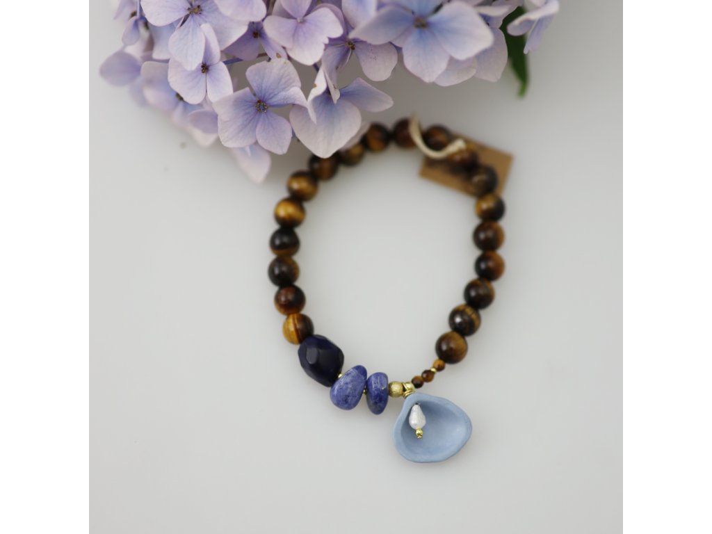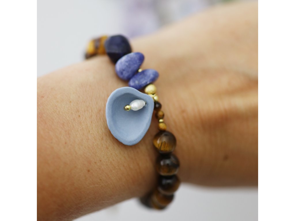 Překrásná porcelánová mušlička v modré skrývá přírodní perlu. Celek pak dotváří minerály fascinujících tvarů a barev. Náramek plný harmonie byl vytvořen s výjimečnou fantazií a citem. Zdařila se báječná spolupráce...