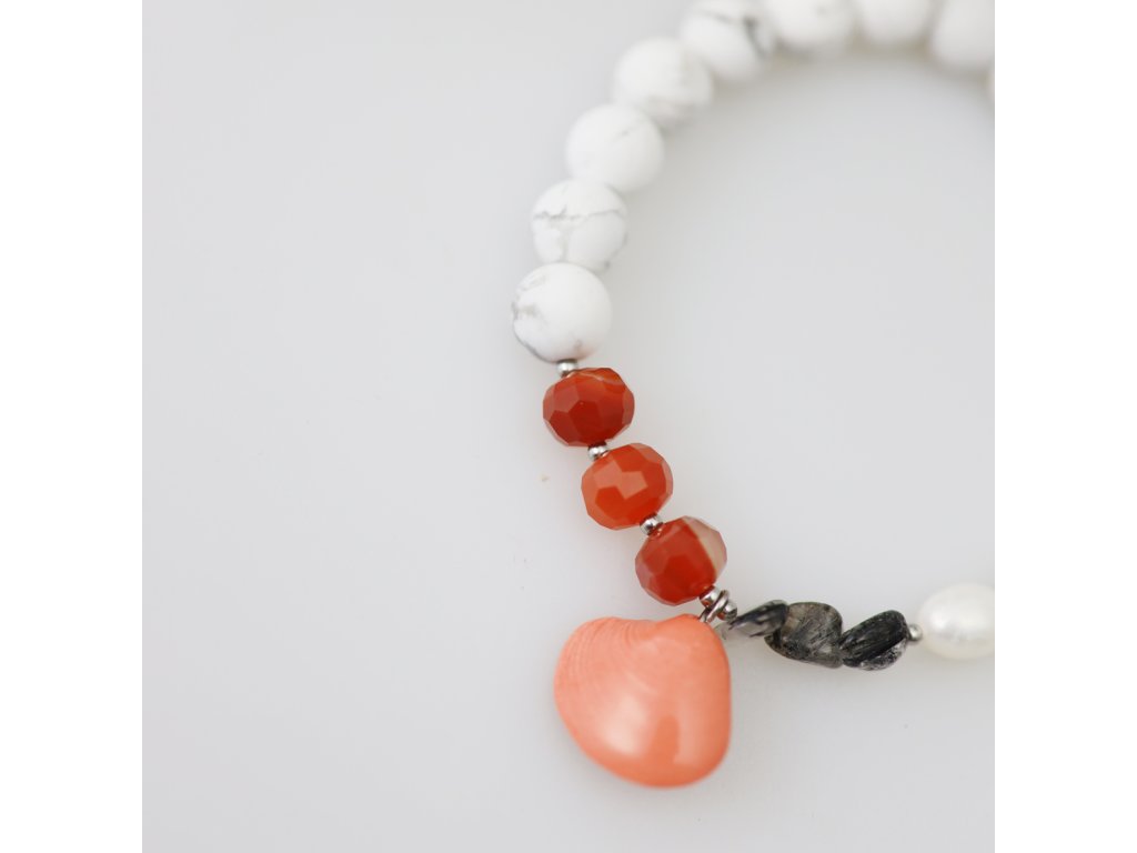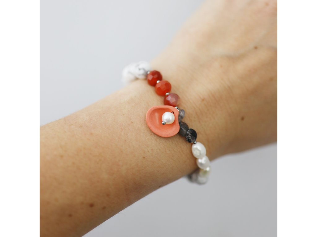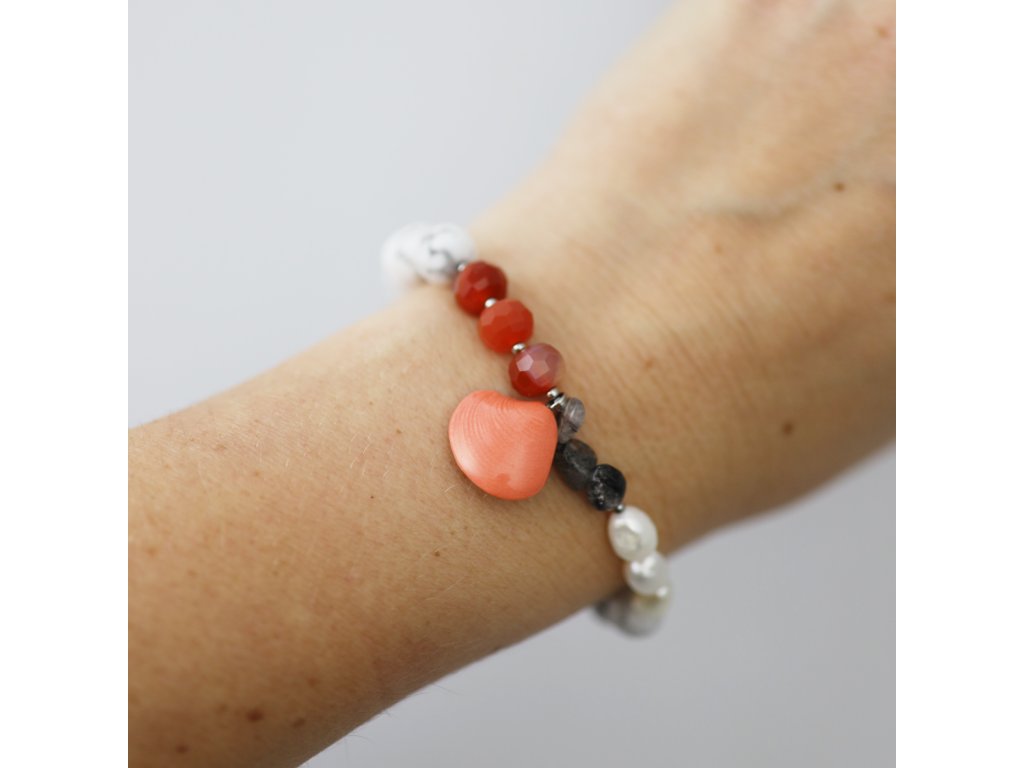 Fascinující, nepřehlédnutelný náramek z minerálů a korálové porcelánové mušličky, která skrývá i odkrývá bělostnou přírodní perlu... Spojení karlovarského porcelánu a minerálů se ukazuje být velmi šťastné. Tento unikátní, zcela originální náramek vznikl pouze jedenkrát. Nosit ho budete jen a jen Vy. Druhý stejný nepotkáte, ať už budete kdekoliv...
