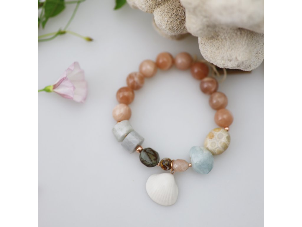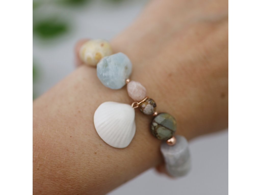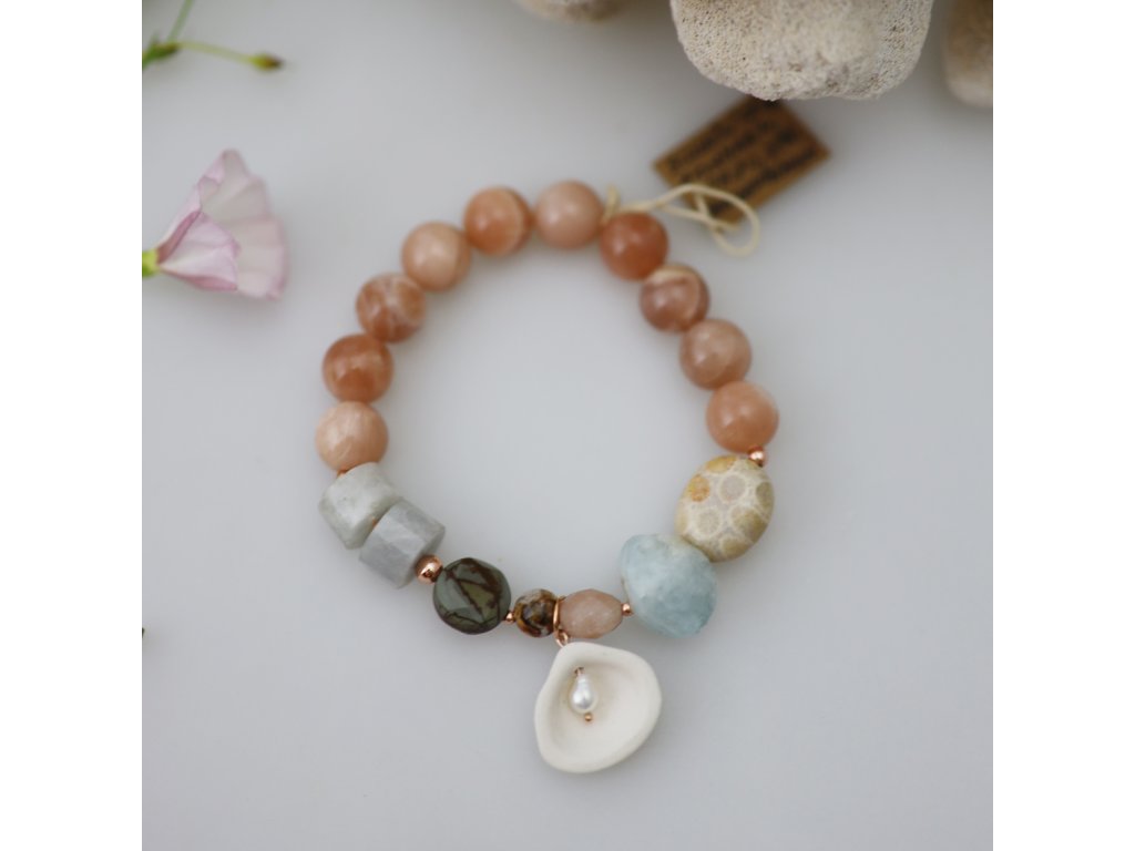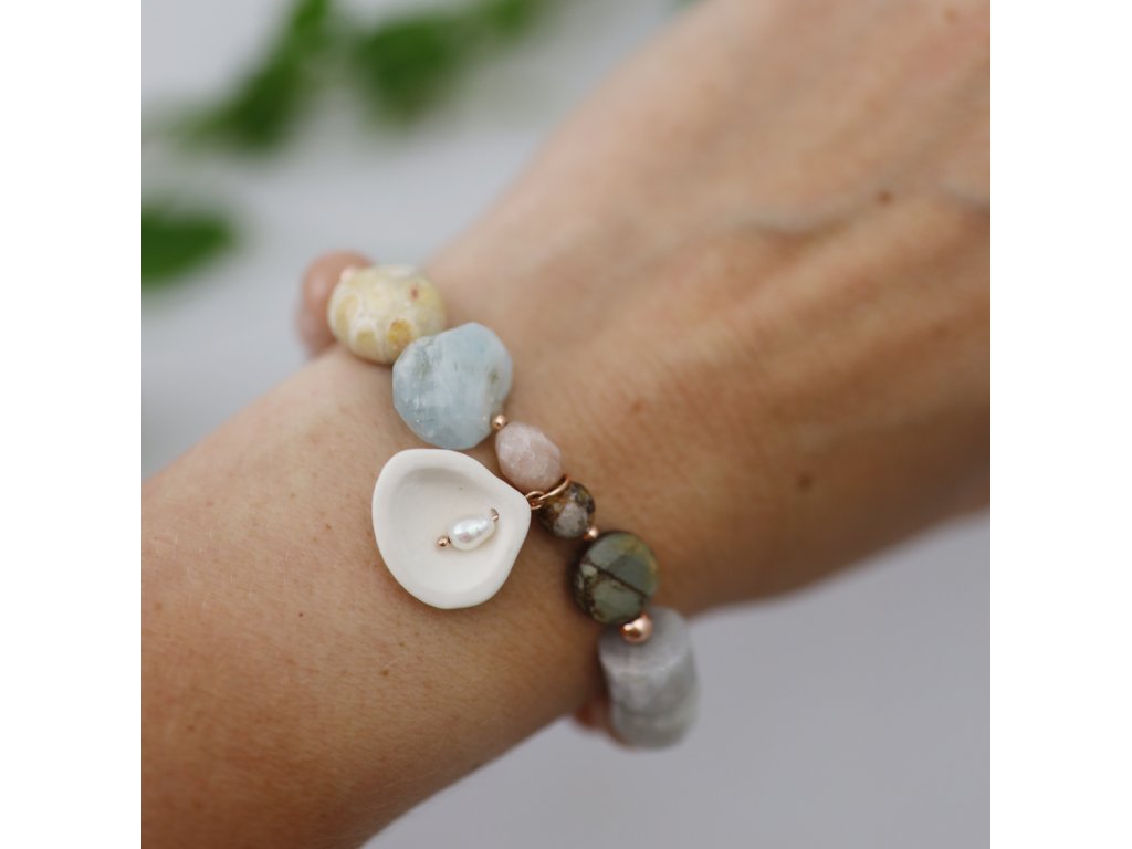 Unikátní šperk pro Vaše zápěstí. Existuje pouze jeden jediný. Náramek s porcelánovou mušlí skrývající přírodní perlu k dokonalosti vylaďují fascinující minerály různých druhů, barev a tvarů. Náramek má neopakovatelný půvab a svou hřejivou barevností navozuje poezii moří a jižních krajin, kde se sluneční záře rozlévá od časného rána do noci... Zkrášlete se tímto dílkem výjimečné krásy. Hodí se i jako dárek blízké osobě.