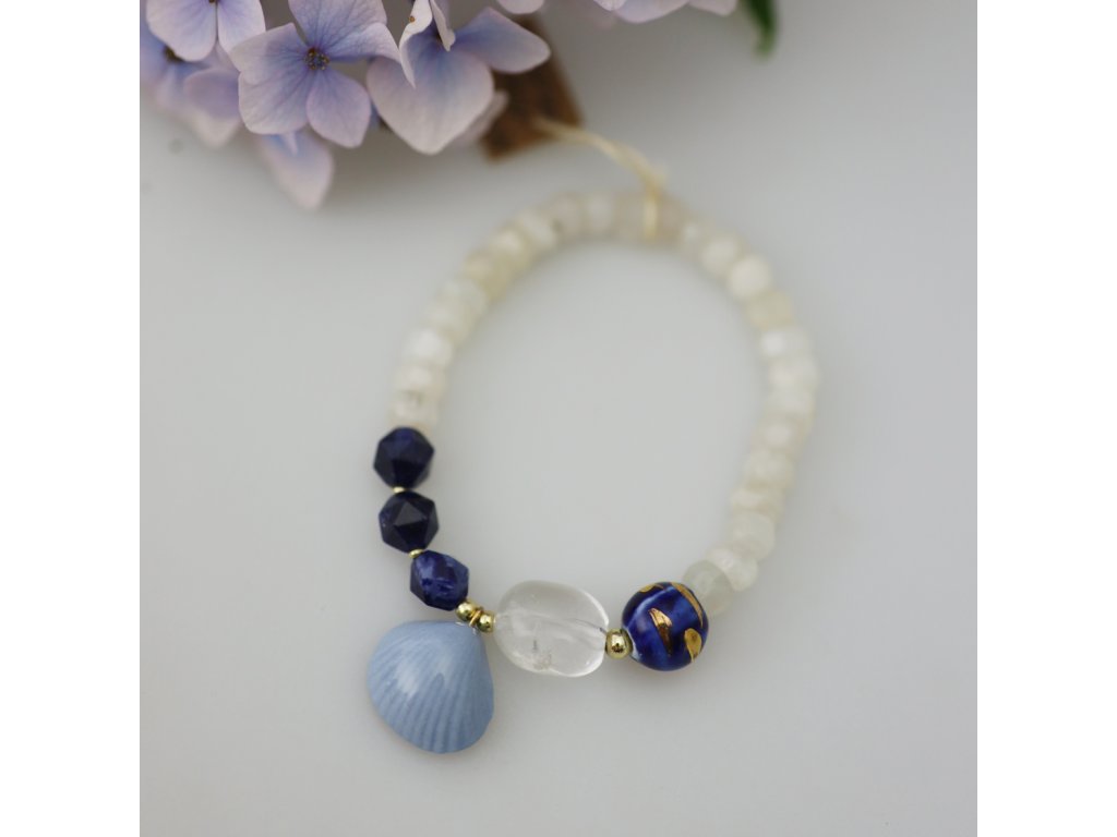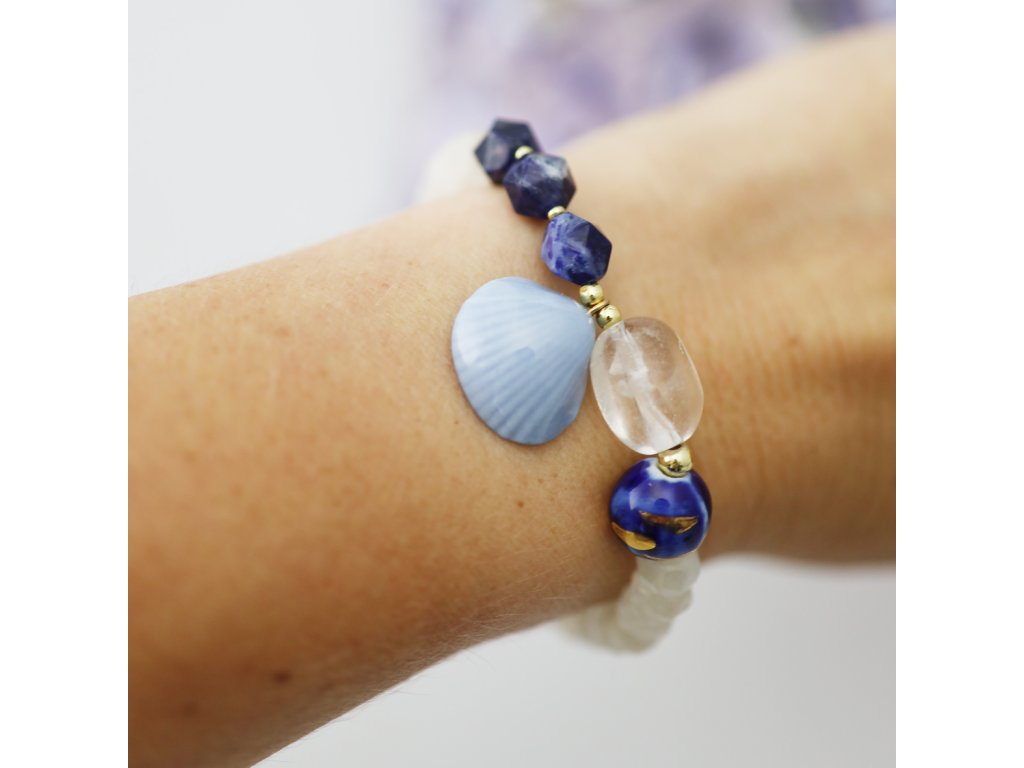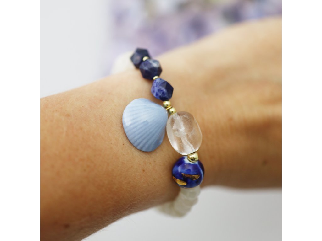 Výjimečně krásný, unikátní náramek s blankytnou porcelánovou mušlí a zlatem malovaným porcelánovým korálkem v kobaltově modré je geniálně dotvořen fascinujícími minerály. Skvostný doplněk vašeho outfitu, divukrásná ozdoba vašeho zápěstí... Náramek neujde pozornosti a těšit bude při každém pohledu i vás. Originální elegance pro každý den s poezií moří byl vytvořen pouze jedenkrát. Bude Váš?