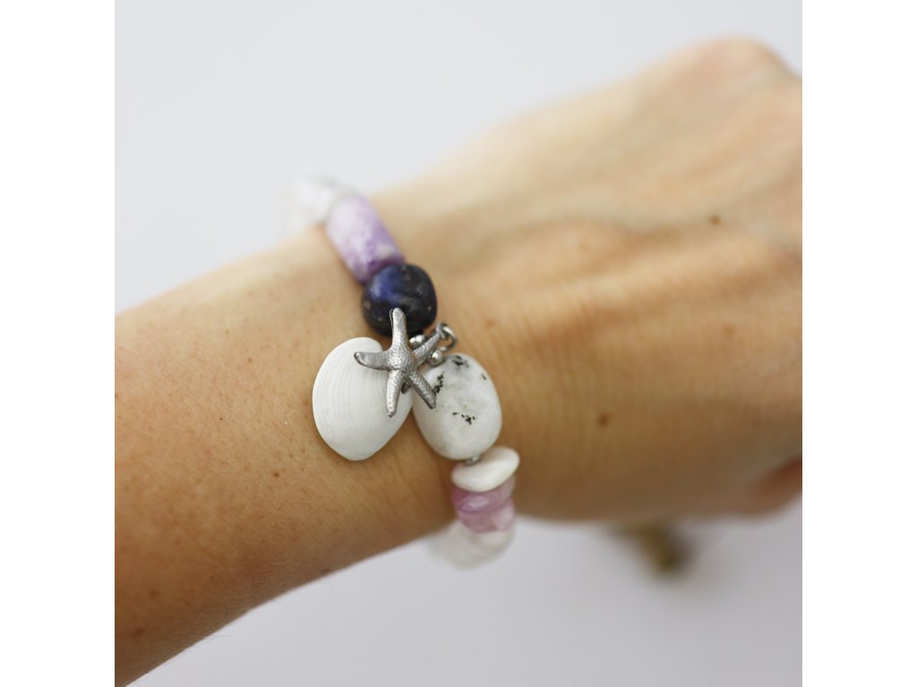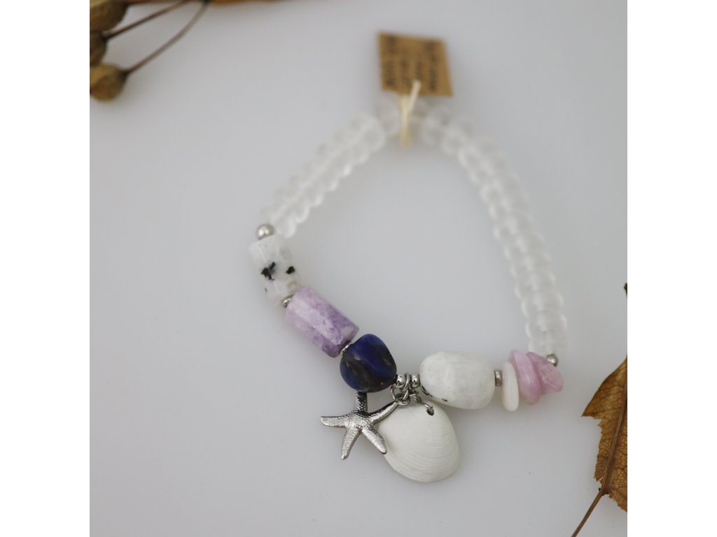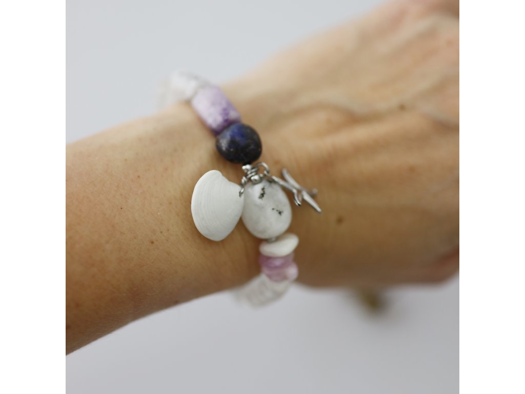 Výjimečně krásný, unikátní náramek s bisquit (neglazovanou) mušlí je dotvořen fascinujícími minerály.