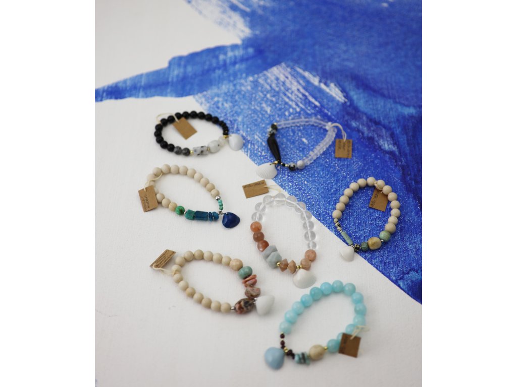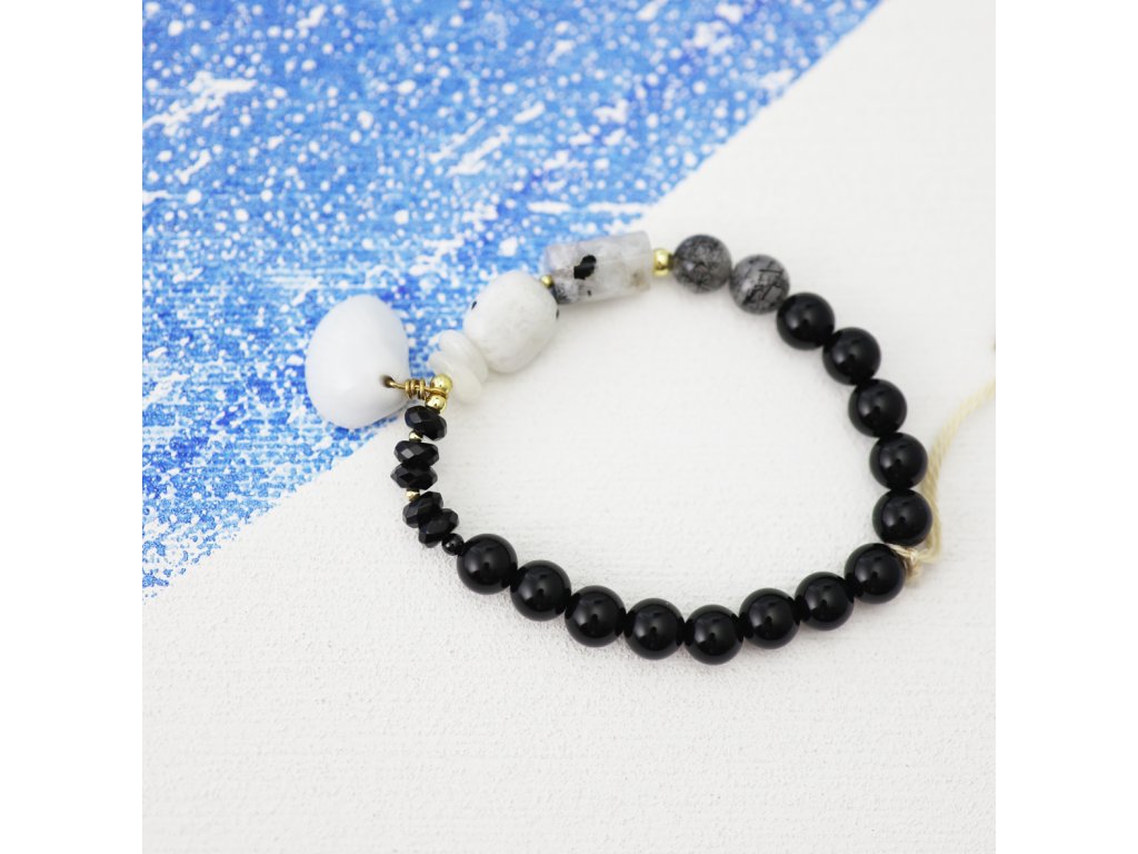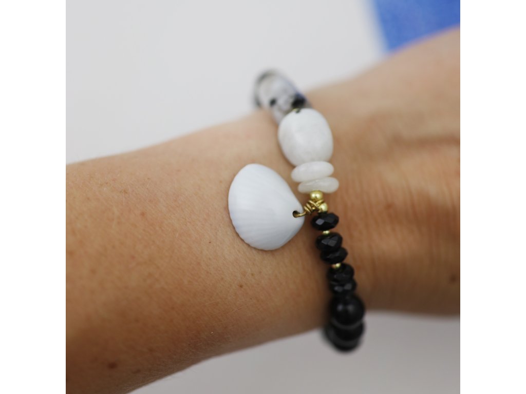 Elegance v bílé a černé se zde představuje v netradičním a mimořádně zdařilém pojetí. Unikátní náramek s bílou porcelánovou mušličkou, kterou obklopují blahodárné polodrahokamy, se bude jako pravý skvost vyjímat na vašem zápěstí. Krása kamenů se vzájemně umocňuje s krásou líbezné porcelánové mušličky. Užijte si tento jedinečný, nadčasový šperk!
