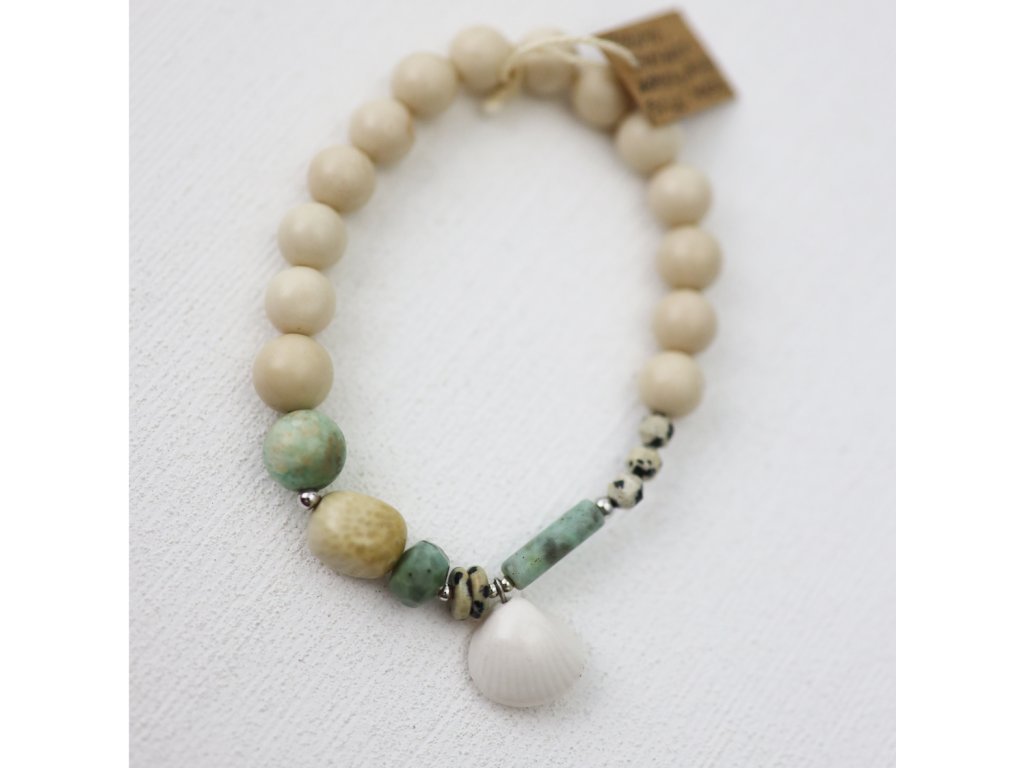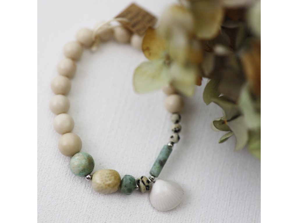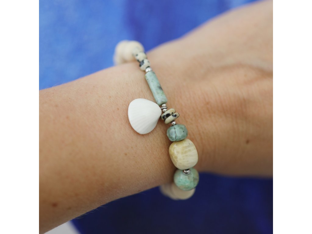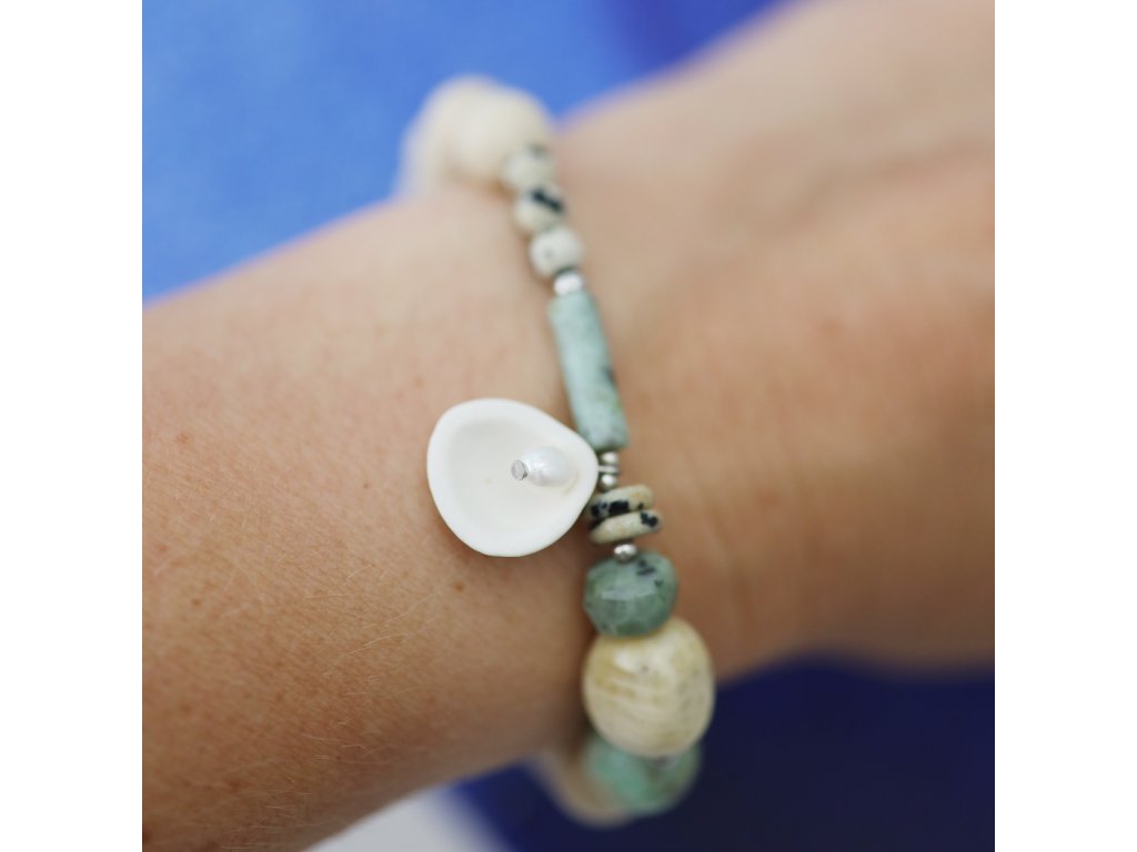 Jemnou, decentní a originální ozdobou vašeho zápěstí se může stát právě tento unikátní náramek, jehož výjimečnost spočívá ve spojení porcelánové mušličky a minerálů v úžasné sestavě. Netradičně elegantní kousek vás pohladí po duši při každém pohledu. Je zajímavý, svěží a zkrátka neodolatelný. Tenhle skvost si můžete užívat vy sama, ale může se též stát krásným dárkem blízké osobě.