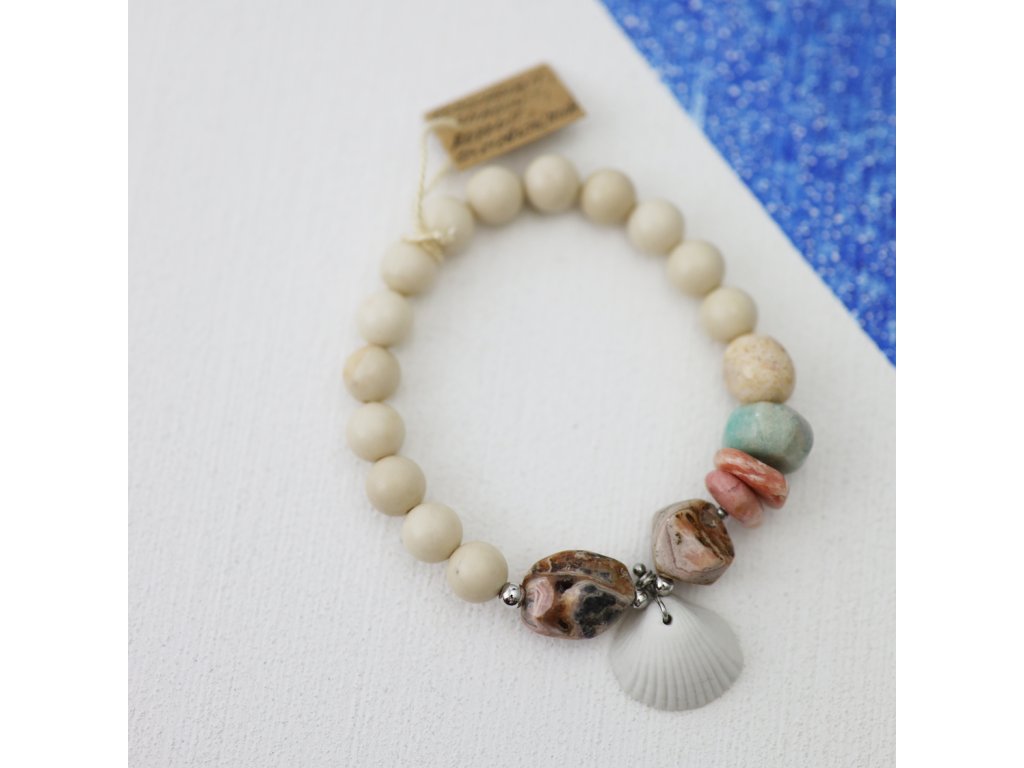 Decentní a zároveň nepřehlédnutelný - takový je unikátní náramek s porcelánovou bisquit (=neglazovanou) mušličkou a úchvatnou kompozicí minerálů. Prociťte jeho klidnou a zároveň v jistém smyslu bouřlivou krásu. Evokuje jemné spojení člověka a naší planety. Tento zajímavý skvost bude zdobit a těšit jen a jen vás. Může se však stát i krásným dárkem.