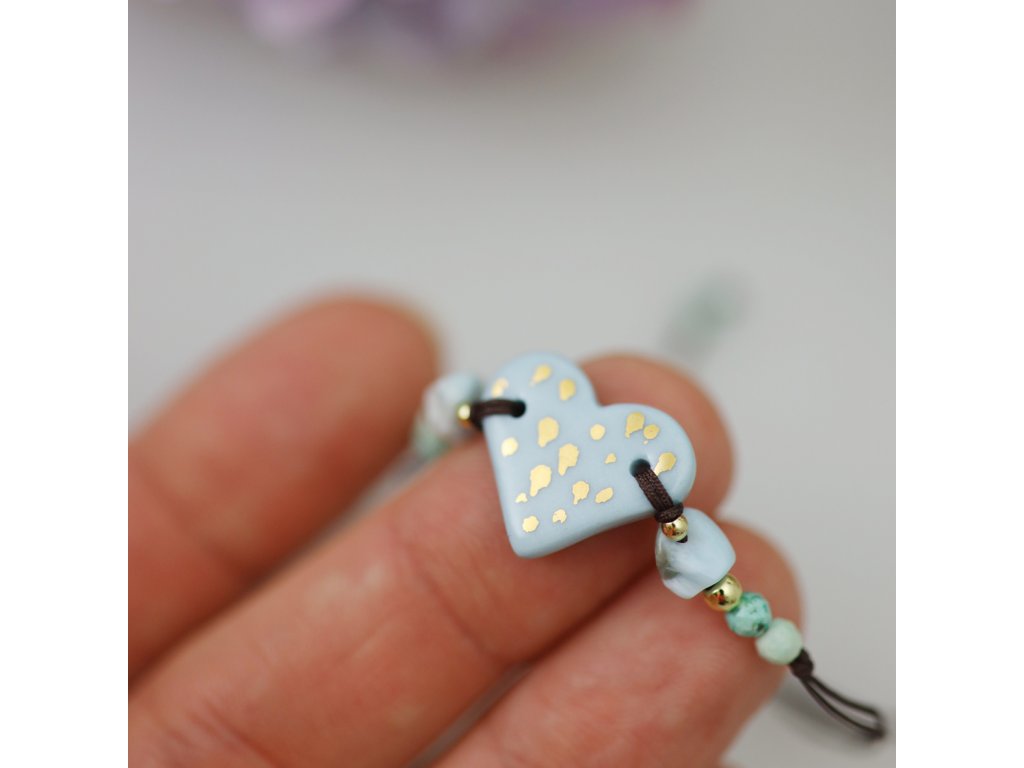 Unikátní náramek na šňůrce, jehož středobod tvoří porcelánové srdíčko, se může stát Vaším talismanem a připomínkou nejvzácnějšího citu. Nebesky modré, porcelánové srdíčko bylo ručně malováno zlatem. Symbolizuje čistou lásku, odvahu a statečnost. Z každé strany srdíčko obklopují minerály, které dovádějí celek k naprosté harmonii. Náramek se příjemně nosí, jeho velikost si můžete nastavit dle potřeby.