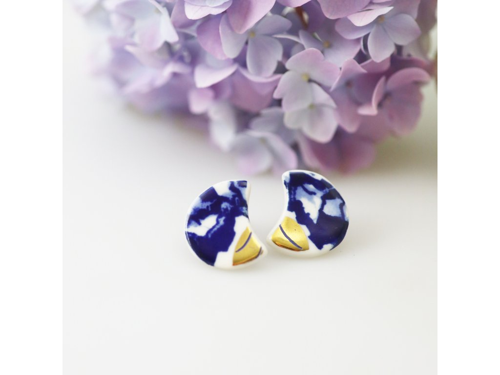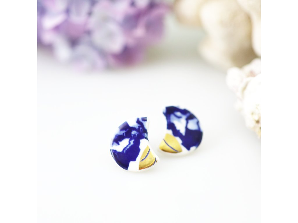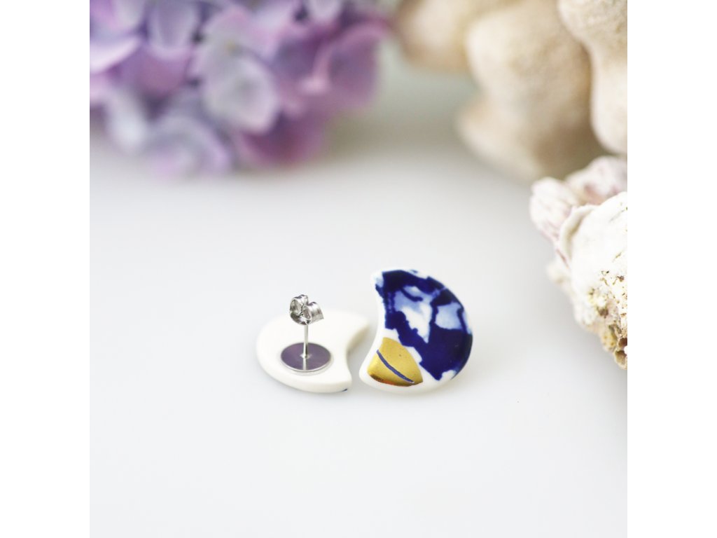 Elegantní porcelánové náušnice s modro zlatým dekorem Vám budou slušet vždy. Dobře padnou, příjemně se nosí a jejich neotřelá, originální krása a styl zdůrazní Váš půvab. Hodí se pro každodenní nošení, můžete je však povýšit na náušnice slavnostnější, pokud k outfitu přidáte třeba brož ve zlatém odlesku, nebo perly.