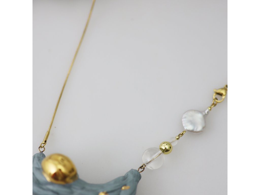 Výjimečný náhrdelník s vévodícím porcelánovým středem Magnolia, který je malován zlatem, oplývá fascinující krásou a elegancí. Magnolia vznikla díky inspiraci plodem magnolie - šáchou. Celek přímo voní uměleckým citem a půvabně jej doplňuje křišťál a přírodní perla. Nádherný šperk se Vám bude skvěle hodit pro slavnostní příležitosti i všední den.