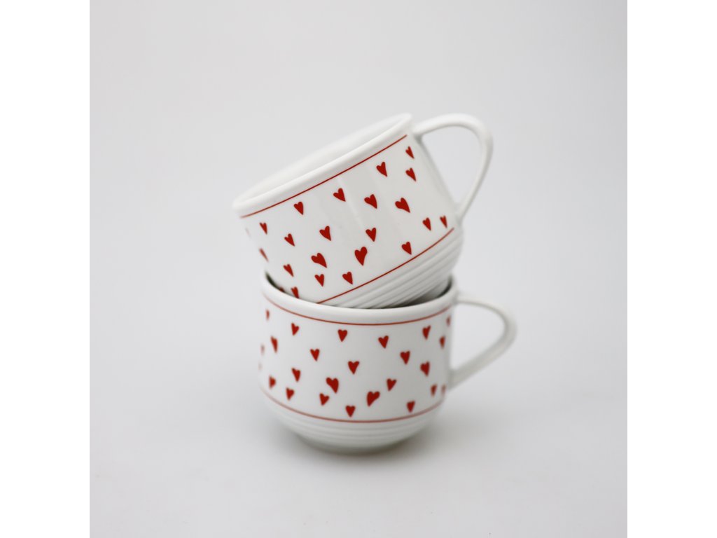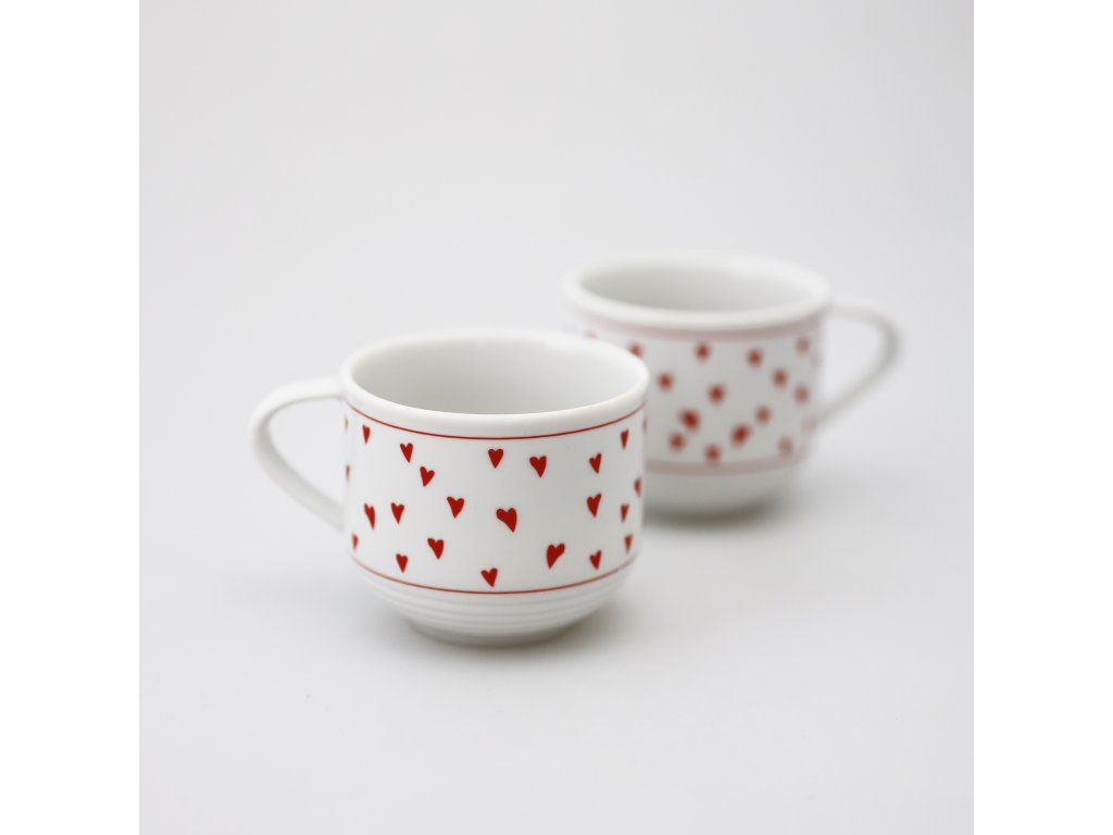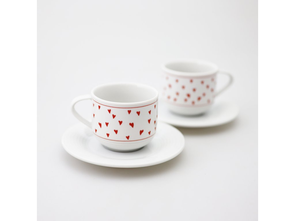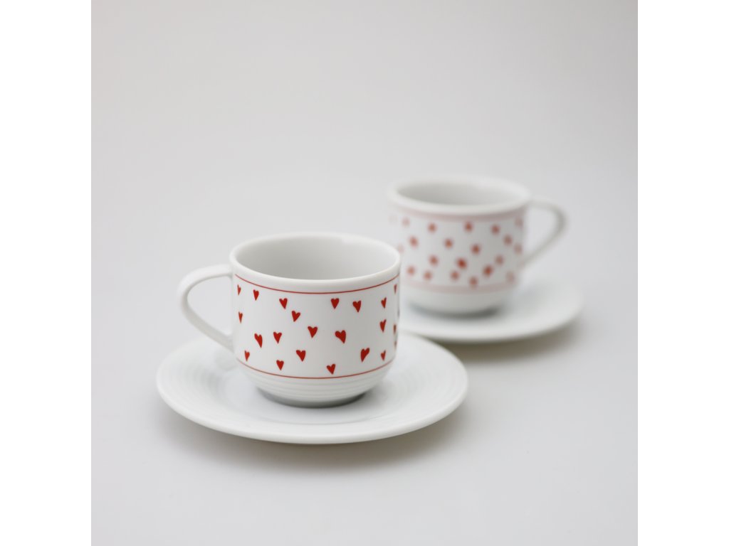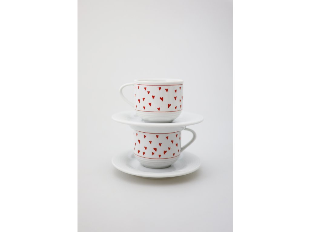 Krásné momenty s oblíbenou kávou umocní půvabný šálek s podšálkem krásného tvaru a jedinečného dekoru. Hravá červená srdíčka spolu s červenými linkami působí stylově. Chvíle s kávou získají nový rozměr. Užijte si je!