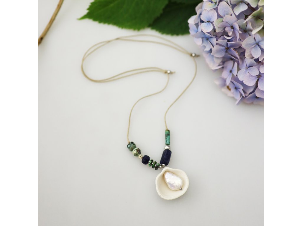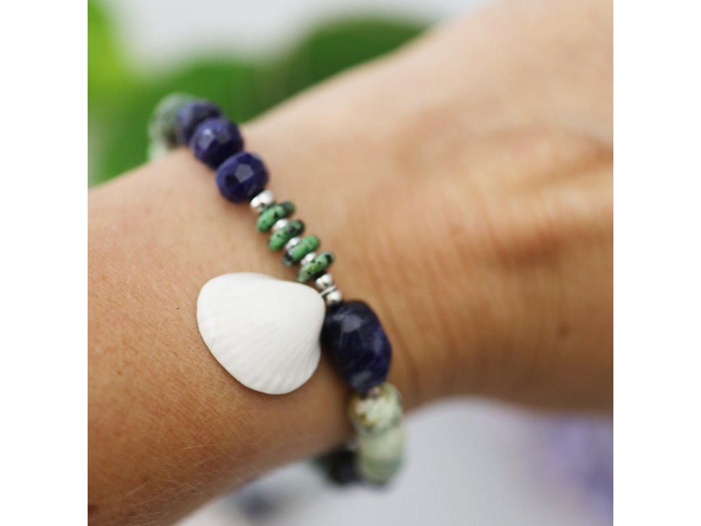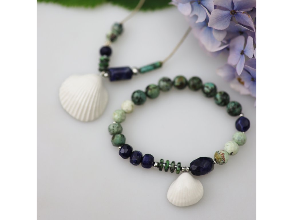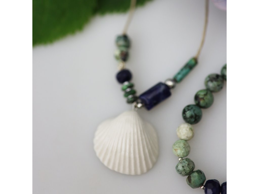 Zajímavost: Mušle byly odpradávna spojovány s ženstvím, s krásou a moudrostí žen. Od počátku renesance, přes baroko a prakticky do dnešních dnů jsou oblíbeným stylizovaným prvkem v malířství, sochařství, architektuře i šperkařství. Perla, drahokam moří a řek, je symbolem čistoty a proměny. Perly vzbuzují v ženách ženskou krásu, rozum a rozvahu. Tyrkysu se připisuje vlastnost pobízet naši duši k čistotě citu, mysli i jednání. Probouzí intuici a pomáhá rozptylovat negativní vlivy. Sodalit je kamenem jasné mysli. Uklidňuje emoce tak, abychom si dokázali ujasnit, co chceme. Dodává nám sebedůvěru, vnímání inspirace a kreativitu.