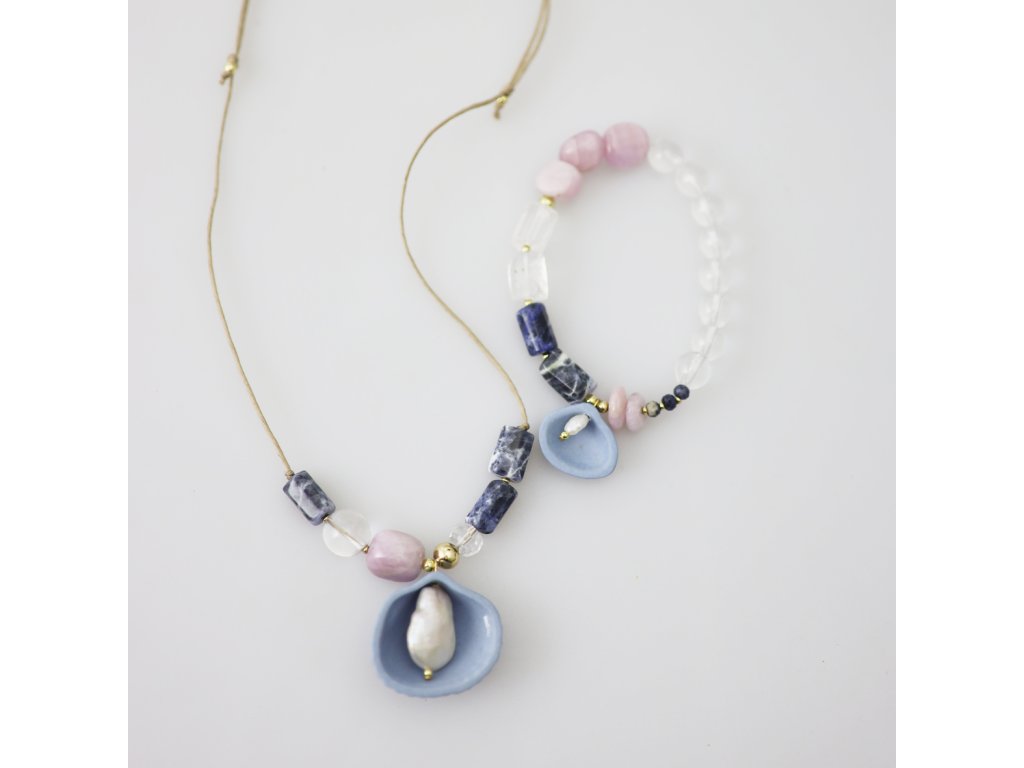 Fantastický set náhrdelníku a náramku s bílou porcelánovou mušlí je zcela unikátní, a proto bude zdobit jen a jen Vás. Jedinečné spojení porcelánového prvku a minerálů nepřestane okouzlovat. Vznikl díky spolupráci s Lucií Junghansovou, která porcelánovou mušličku doplnila o polodrahokamy v mimořádné kompozici.