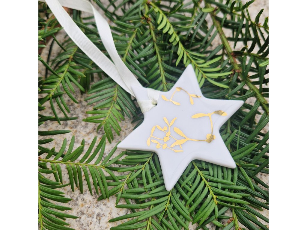 Stylová vánoční hvězdička z porcelánu může být jak samostatným doplňkem interiéru, tak překrásnou ozdobou vánočního stromku či aranžmá z větví jehličnanu ve váze. Jemná krása této originální ozdoby nese motiv jmelí, které - jak známo - přináší do domu štěstí, zdraví a hojnost.