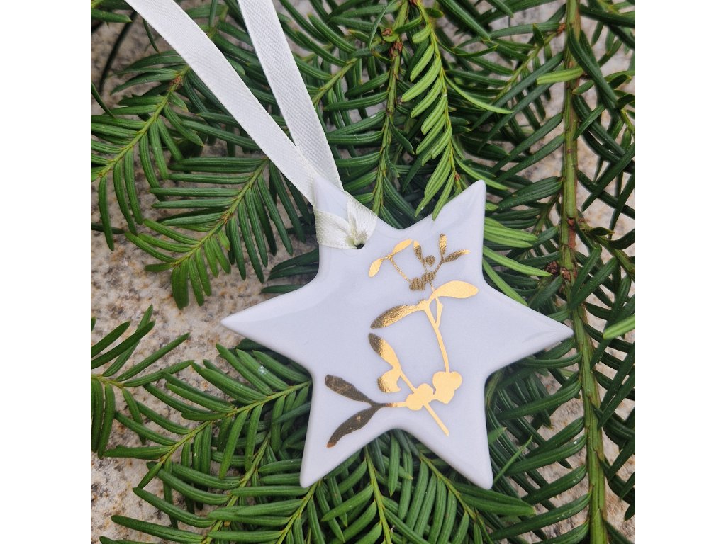 Stylová vánoční hvězdička z porcelánu může být jak samostatným doplňkem interiéru, tak překrásnou ozdobou vánočního stromku či aranžmá z větví jehličnanu ve váze. Jemná krása této originální ozdoby nese motiv jmelí, které - jak známo - přináší do domu štěstí, zdraví a hojnost.