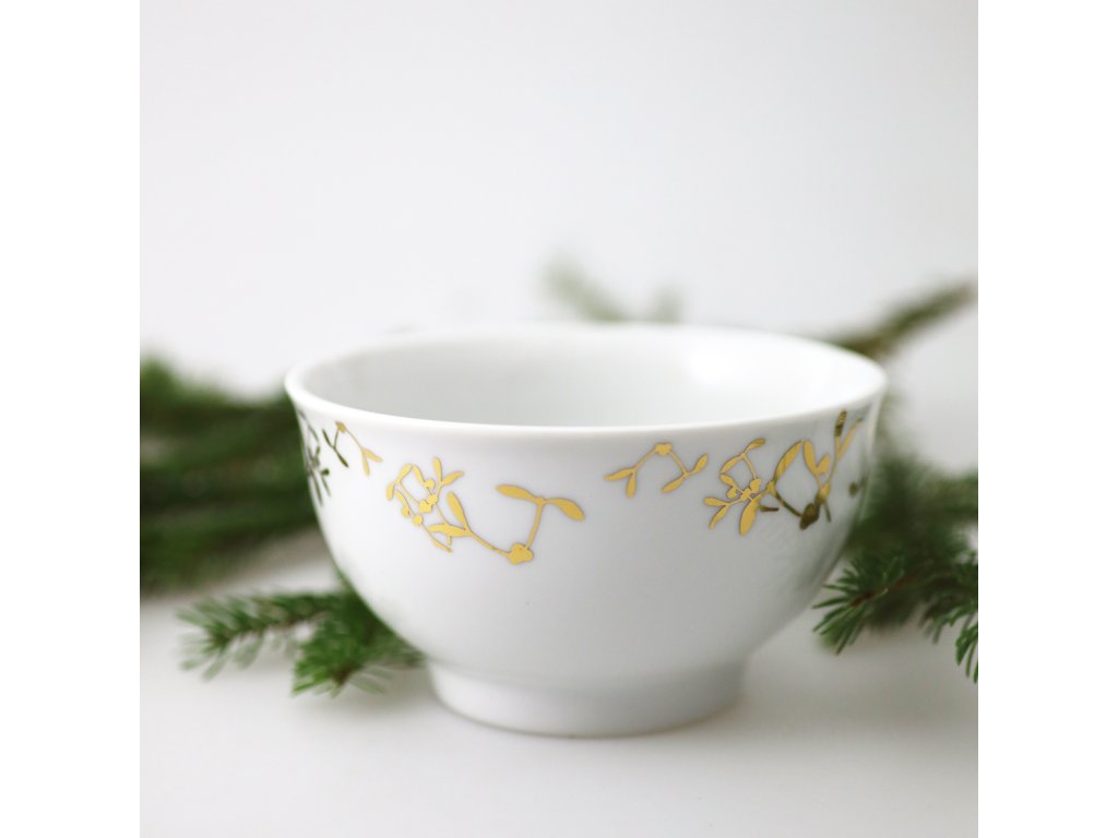 Originální porcelánová miska se zlatým dekorem jmelí je jako stvořená pro elegantní a vkusné vánoční stolování. Servírujte s grácií! Cukroví, ořechy nebo drobné občerstvení k vínu se v ní budou báječně vyjímat. Traduje se, že jmelí nosí do domácnosti štěstí...