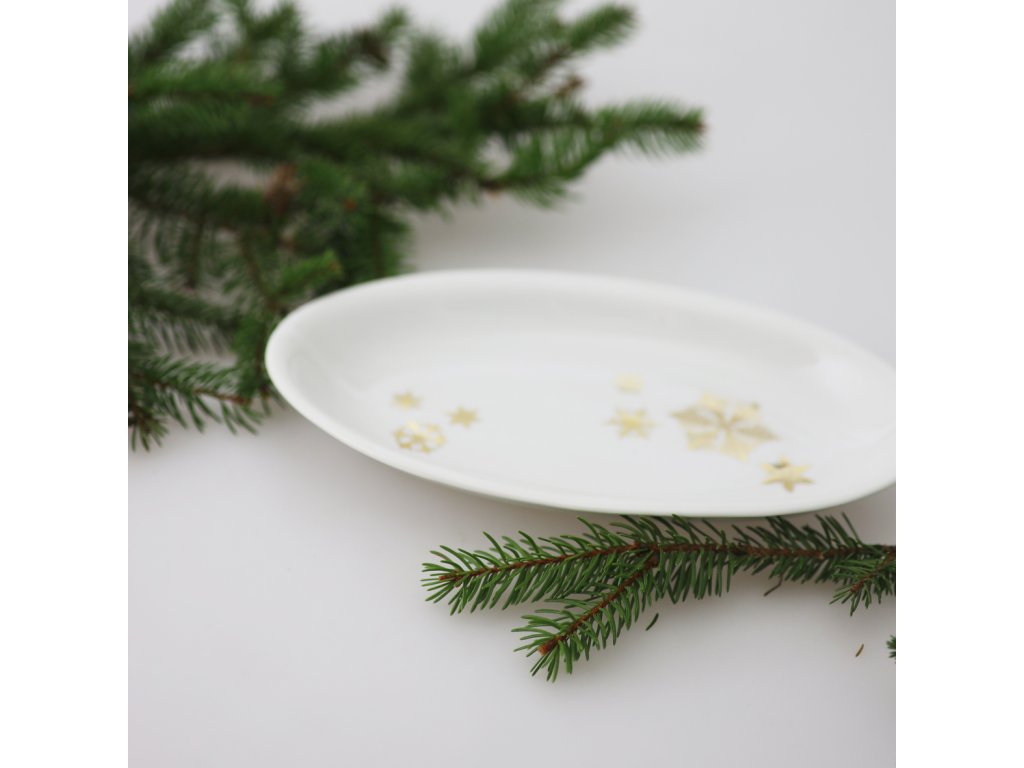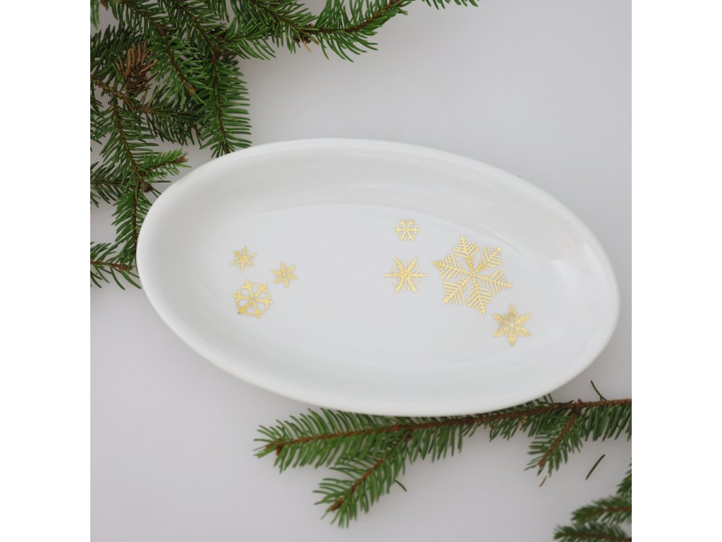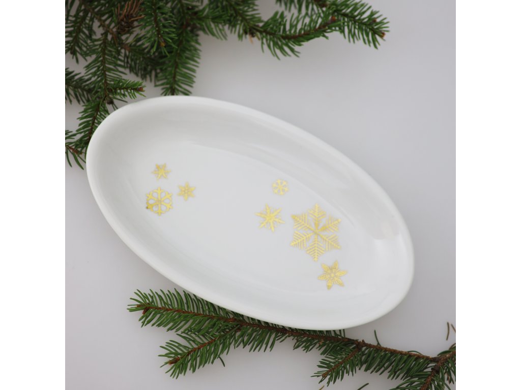 Tomuto originálnímu porcelánovému tácu s dekorem zlatých vloček nechybí elegance, úcta k tradici ani vtip a styl typický pro Studio Malíská. Tác svou krásou prozáří sváteční dny a hodí se jak pro servírování cukroví, tak i jednohubek. Pro dekor sněhové vločky se autorka inspirovala mikroskopickými snímky skutečných sněhových vloček. Přináší tak i poezii zimy, vzpomínky na dětskou koulovačku, sáňkování nebo vánoční trh.