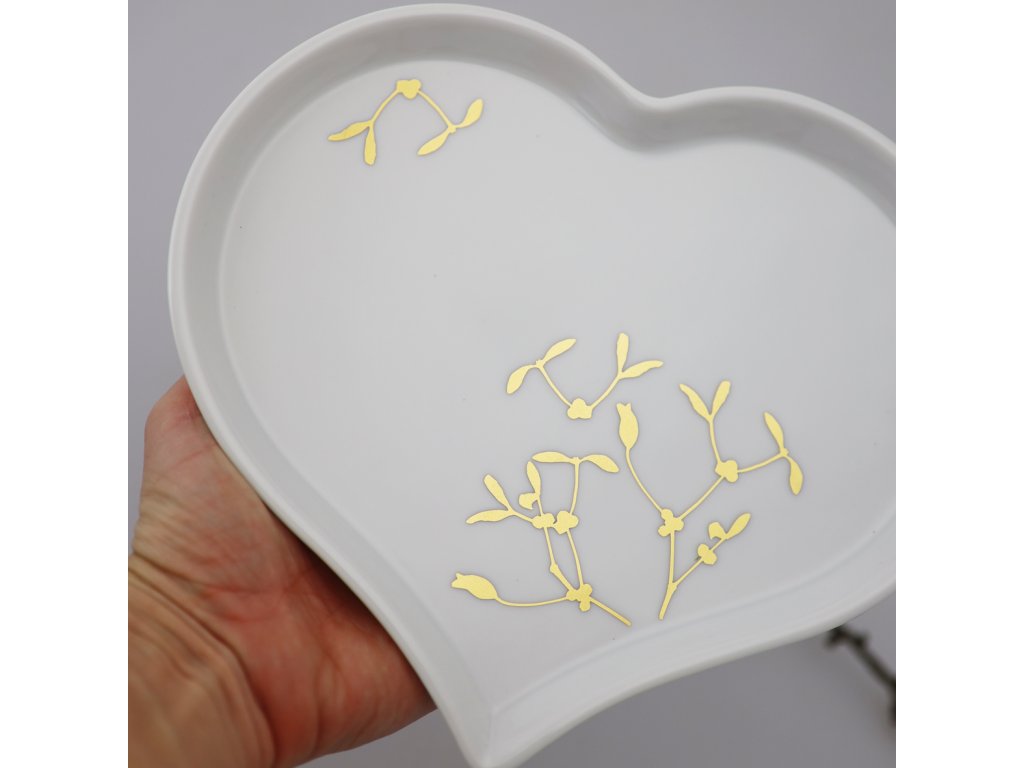 Talíř ve tvaru srdce se zlatým dekorem jmelí dýchá kouzlem i poselstvím Vánoc. Ať jsou sváteční dny ještě krásnější!