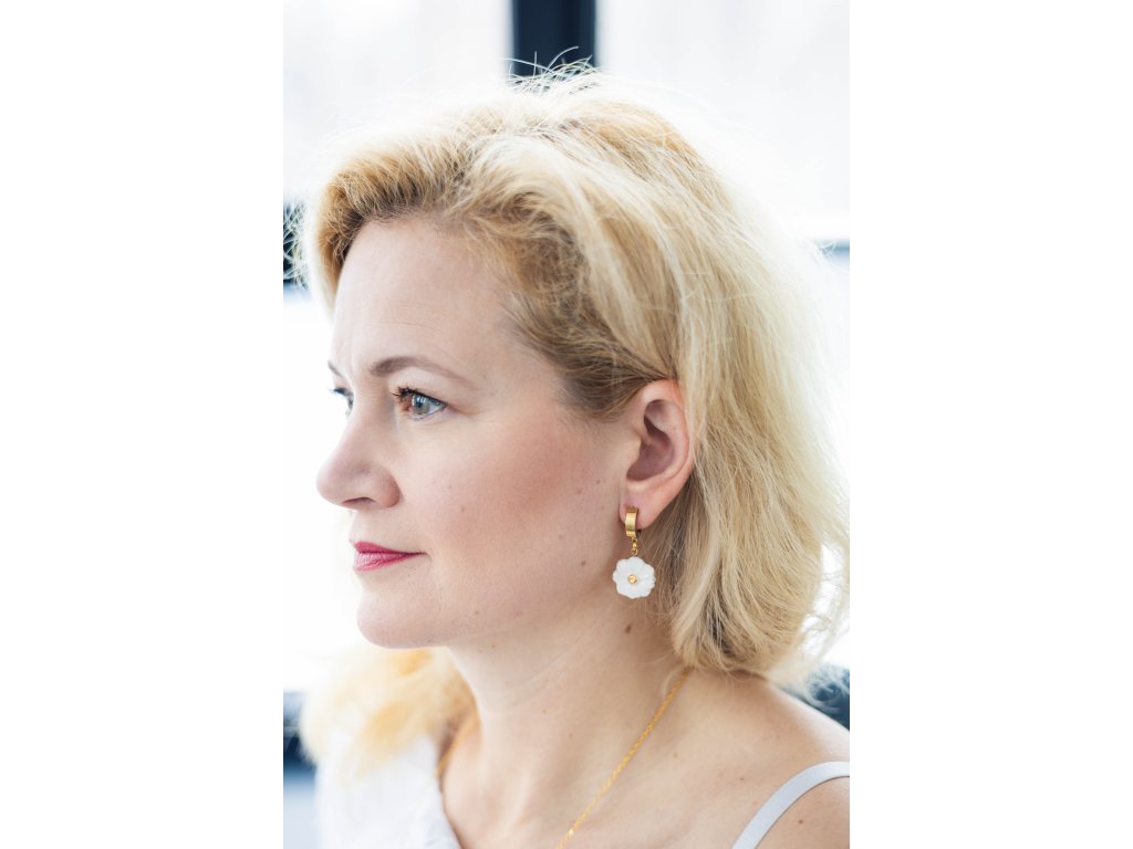 Závěsné náušnice z ikonické kolekce porcelánových šperků Kvítka vás originálně ozdobí a vykouzlí váš jedinečný styl. Romanticky laděné, elegantní náušnice byly kompletně ručně vyrobeny a střed kvítku byl zlacen pravým zlatem.