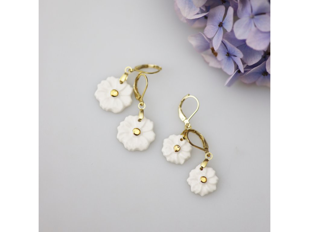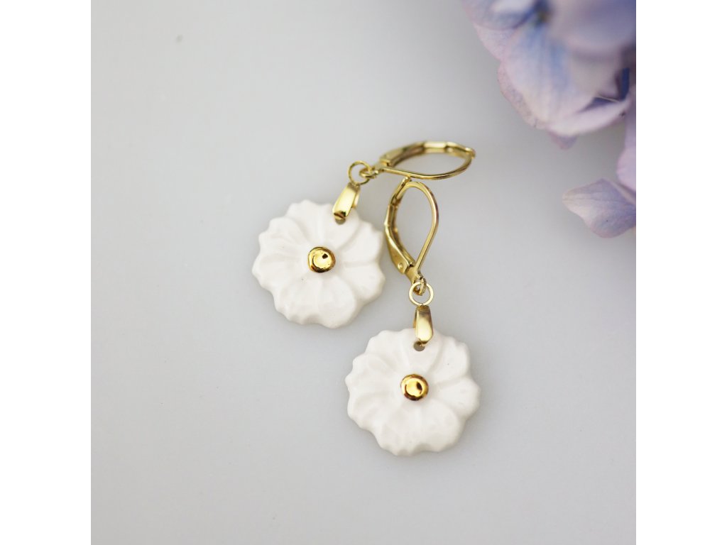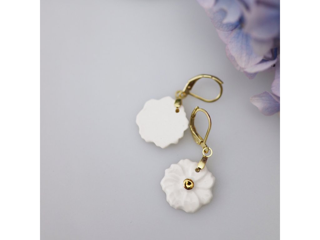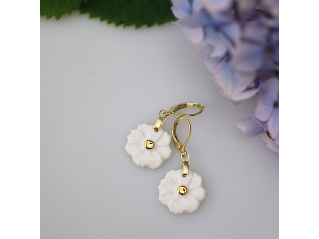 Závěsné náušnice z ikonické kolekce porcelánových šperků Kvítka vás originálně ozdobí a vykouzlí váš jedinečný styl. Romanticky laděné, elegantní náušnice byly kompletně ručně vyrobeny a střed kvítku byl zlacen pravým zlatem. Něžně krásné náušnice pro každý den jsou lehounké, příjemné na nošení a budou skvěle ladit s řadou dalších porcelánových šperků od Studia Malíská.